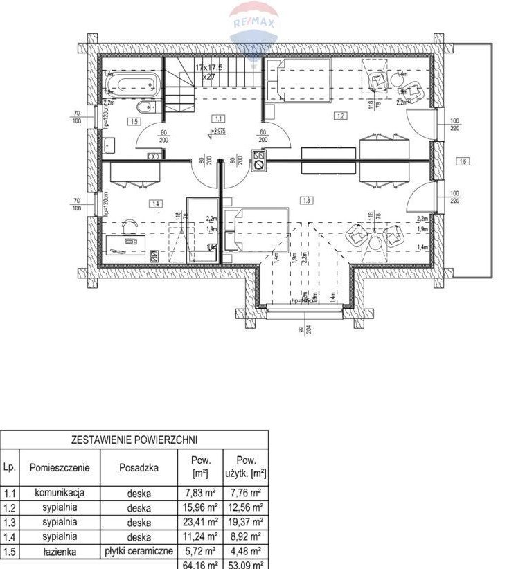 * Piętro: 3 sypialnie, łazienka i duży balkon o pow. 10 mkw.