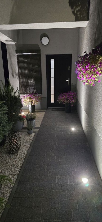 - nowoczesna kostka brukowa (około 120 m2) położony przed posesją (3 miejsca parkingowe) i na całości wjazdu za bramą (brama na pilota wykonana z aluminium i stali na zamówienie), na podjeździe i chodniku automatyczne lampy podjazdowe,