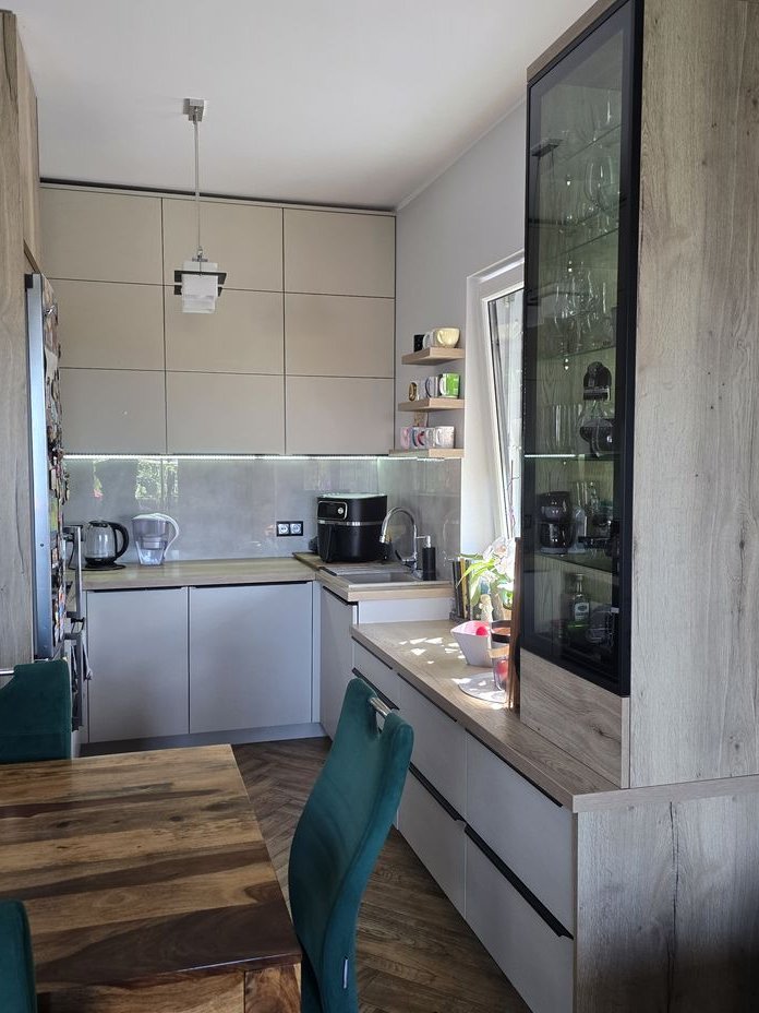 - kuchnia wykonana wg indywidulanego projektu na zamówienie z wysokiej jakości materiałów (okucia i akcesoria Blum, Zobal, sprzęty AGD Samsung i Elektrolux, płyta indukcyjna i inteligentny okap załączający się automatycznie),
