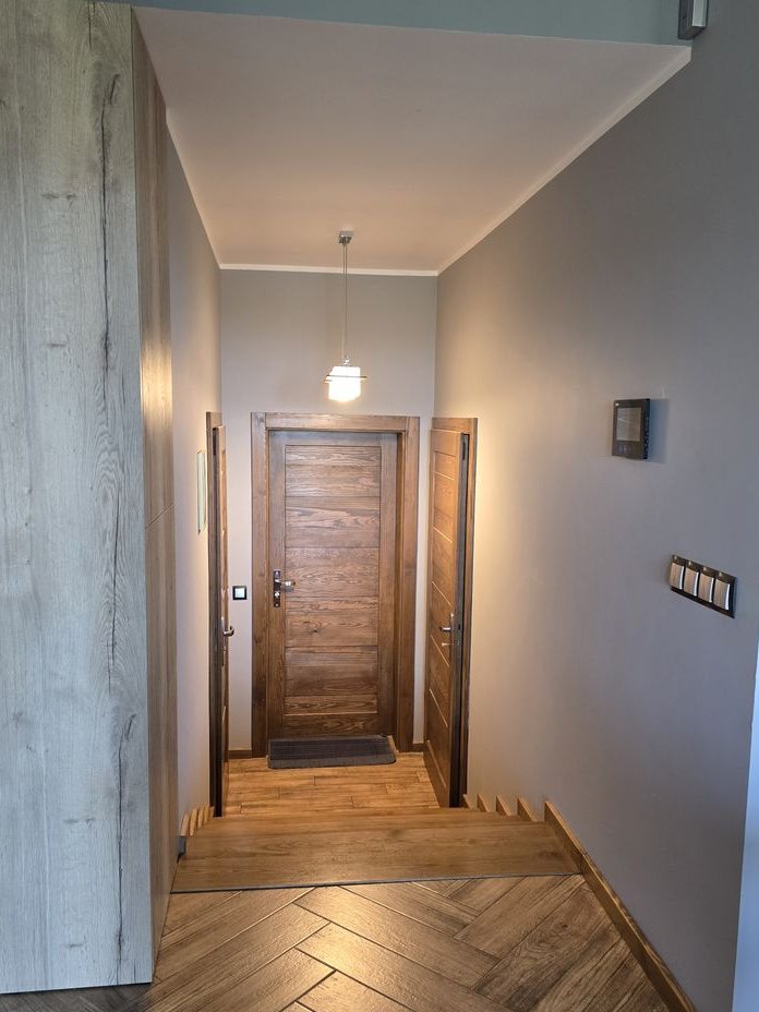 - schody i drzwi wewnętrze drewniane wykonane na zamówienie przez stolarza,
