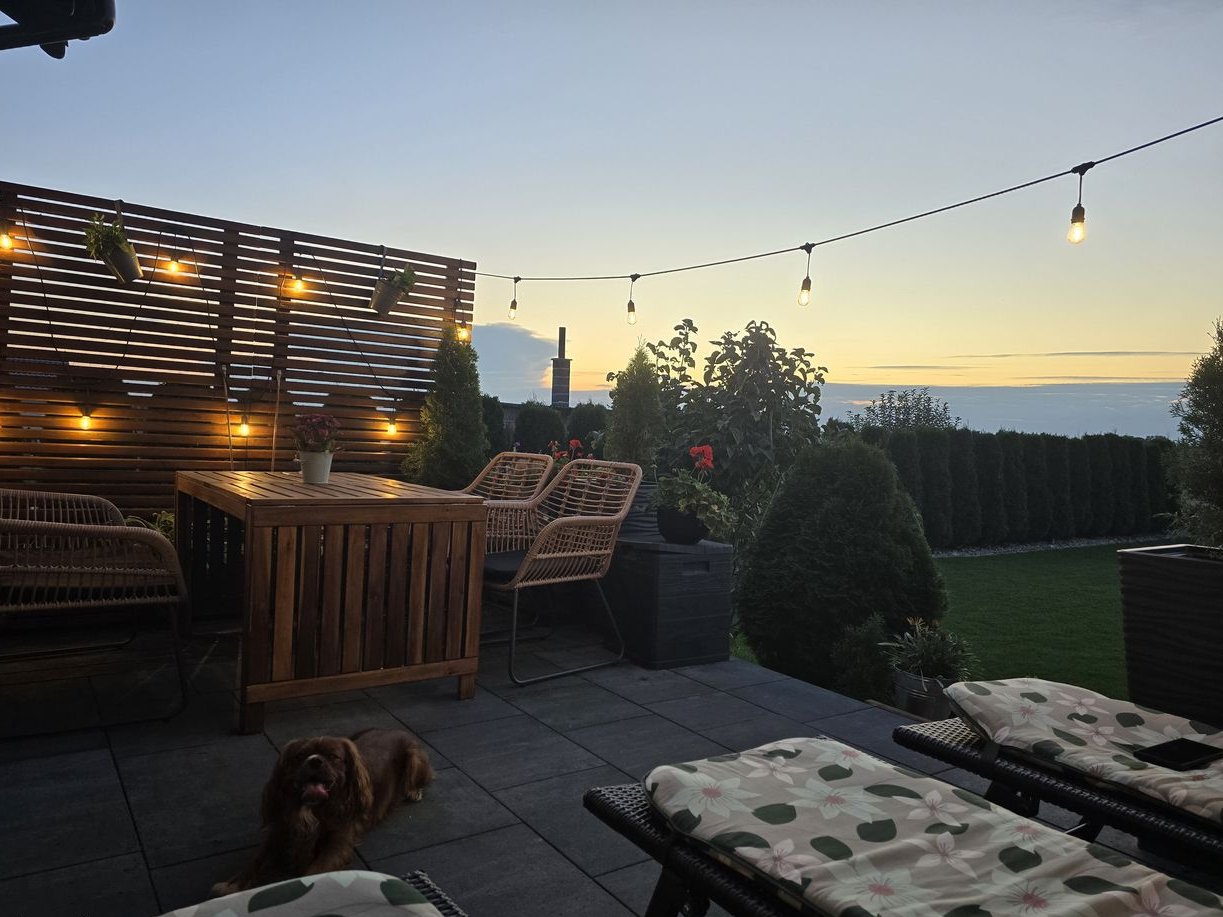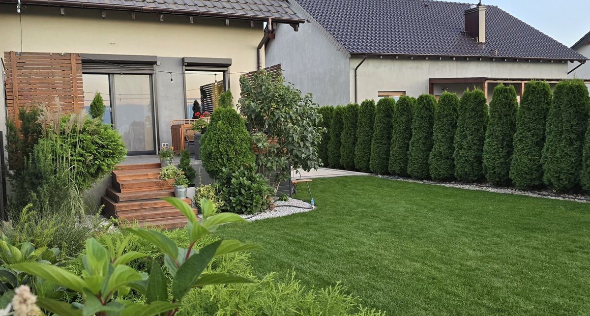 Niewątpliwym atutem nieruchomości jest taras i pięknie zagospodarowany ogród z zadbanym trawnikiem i licznymi roślinami zapewniające miejsce do odpoczynku i relaksu.