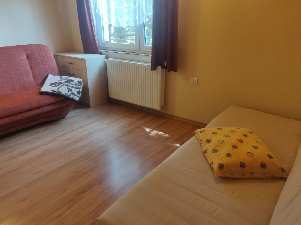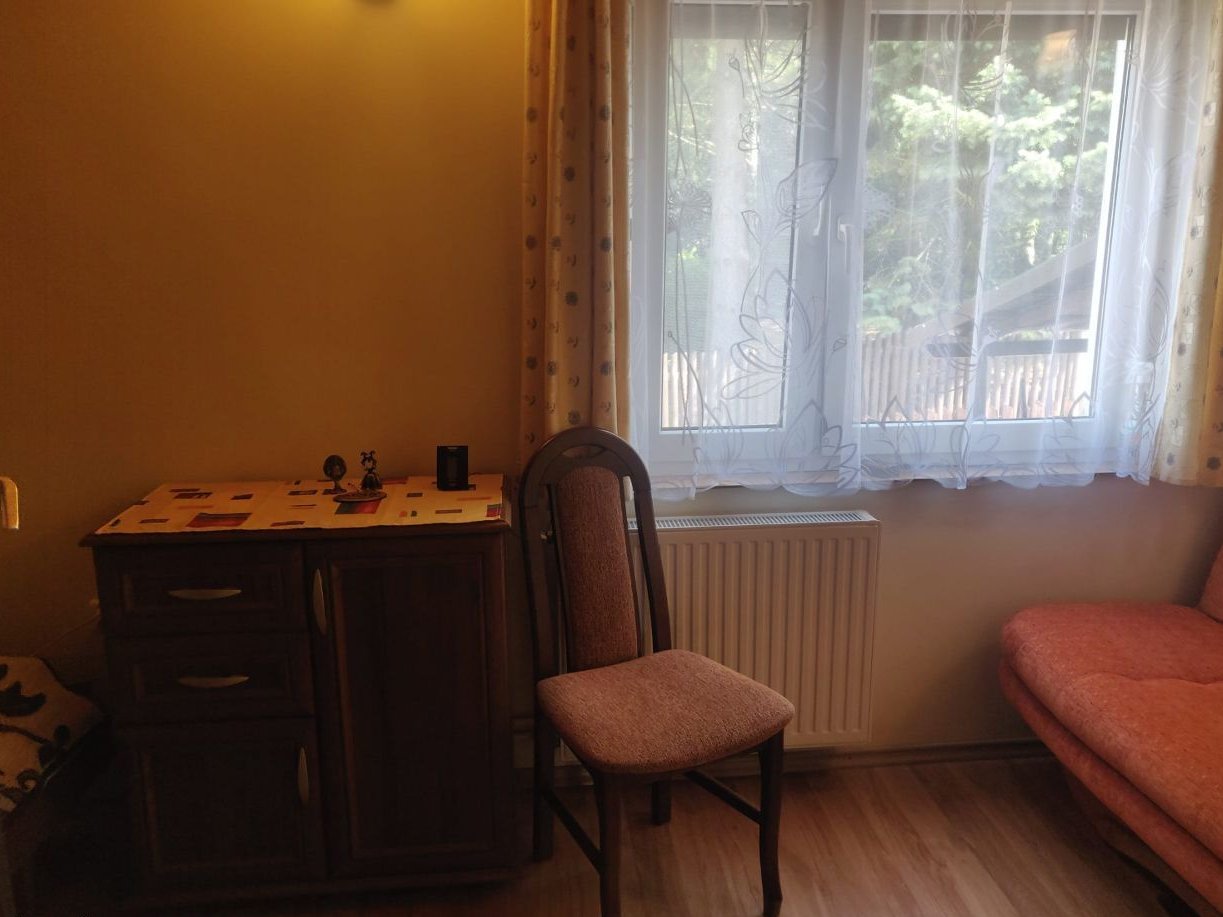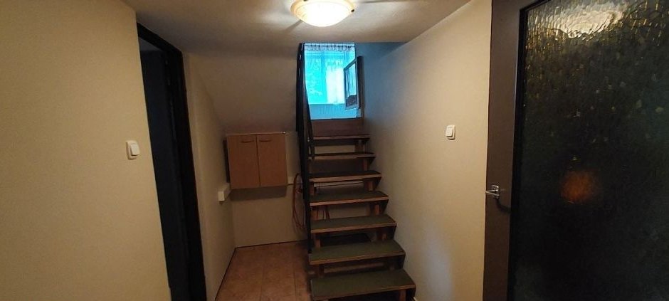 Okna plastikowe, z wyjątkiem jednego dużego drewnianego okna, na oknach rolety antywłamaniowe.