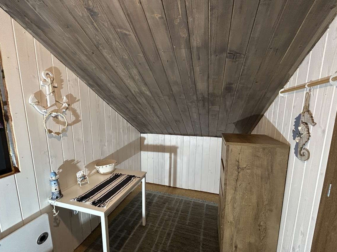Od wewnątrz ocieplona watą i folią paraizolacyjną, wykończona boazerią.