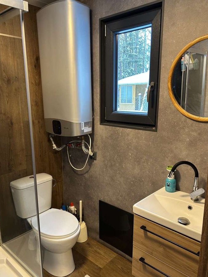 Łazienka - pralka, duża kabina prysznicowa z brodzikiem, hydromasażem i deszczownicą, bojler firmy Ariston (wifi), umywalka.