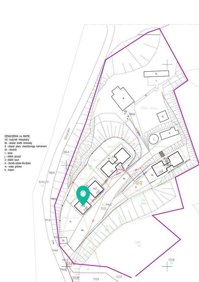 Cały kompleks jest położony na działce o powierzchni 5605 m², natomiast prezentowany domek znajduje się na działce o powierzchni 121 m².