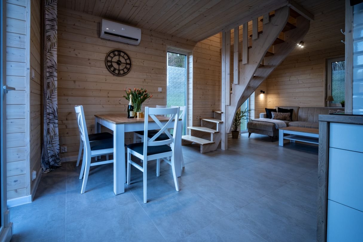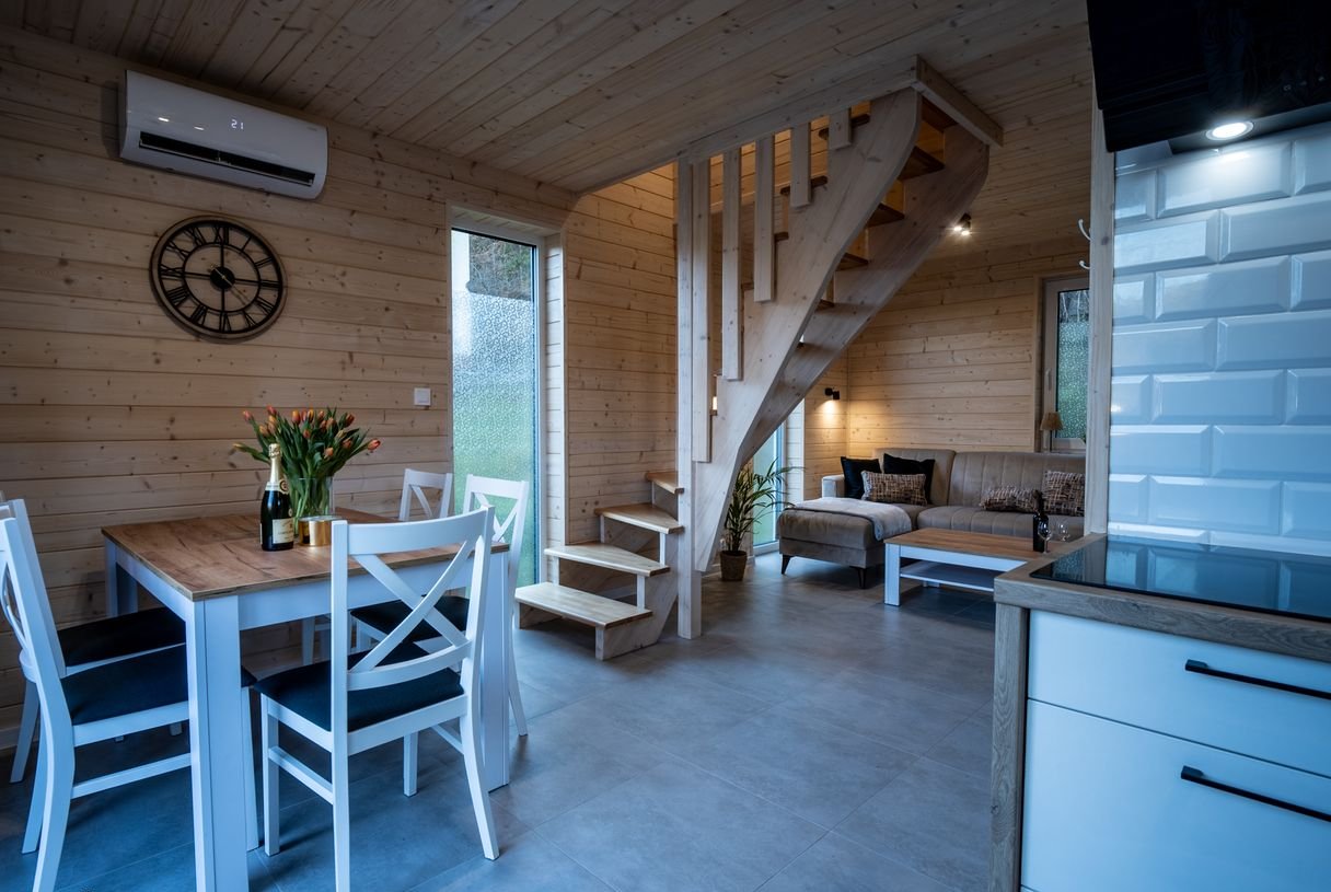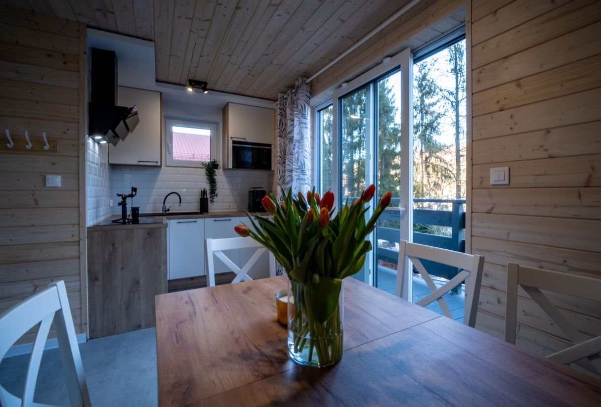 Domek dwu kondygnacyjny , salon z kuchnią i łazienką na pierwszym poziomie kuchnia w pełni wyposażona , na przedpokoju duża szafa do zabudowy, w salonie rozkładany narożnik, stolik oraz duży stół jadalny. Salon z wyjściem na taras gdzie można wypić poranną kawę w towarzystwie widoku na Beskidy. Na drugim poziomie dwie zamykane sypialnie z dużym oknem i widokiem na góry. Domek jest wyposażony w klimatyzację.