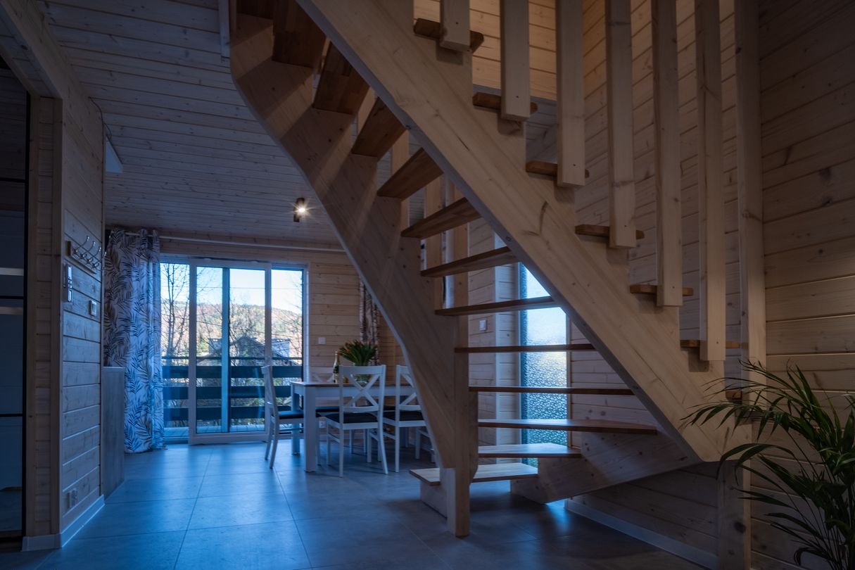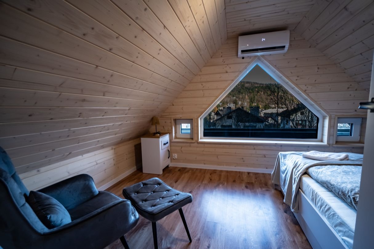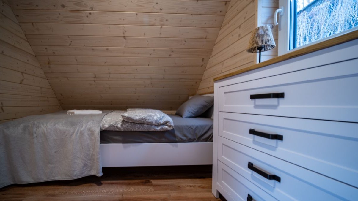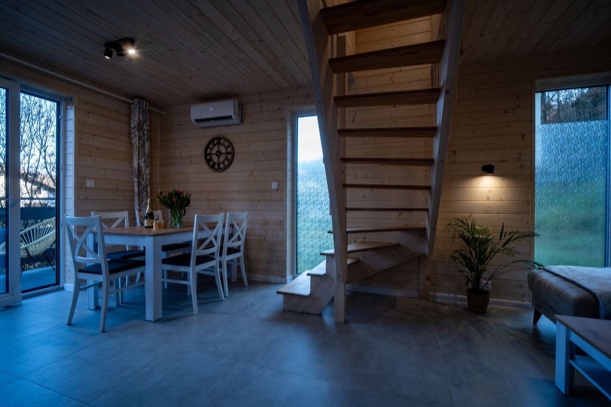 Domek dwu kondygnacyjny , salon z kuchnią i łazienką na pierwszym poziomie kuchnia w pełni wyposażona , na przedpokoju duża szafa do zabudowy, w salonie rozkładany narożnik, stolik oraz duży stół jadalny. Salon z wyjściem na taras gdzie można wypić poranną kawę w towarzystwie widoku na Beskidy. Na drugim poziomie dwie zamykane sypialnie z dużym oknem i widokiem na góry. Domek jest wyposażony w klimatyzację.