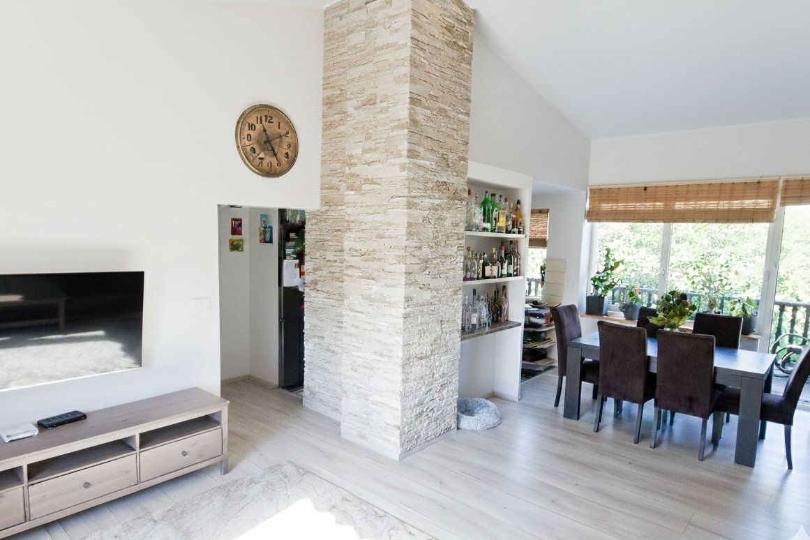 Na górnej kondygnacji o powierzchni 128 m znajdują się cztery pokoje: duży, przestronny salon z kuchnią z wyjściem na taras, 3 sypialnie oraz łazienka z wanną i prysznicem.