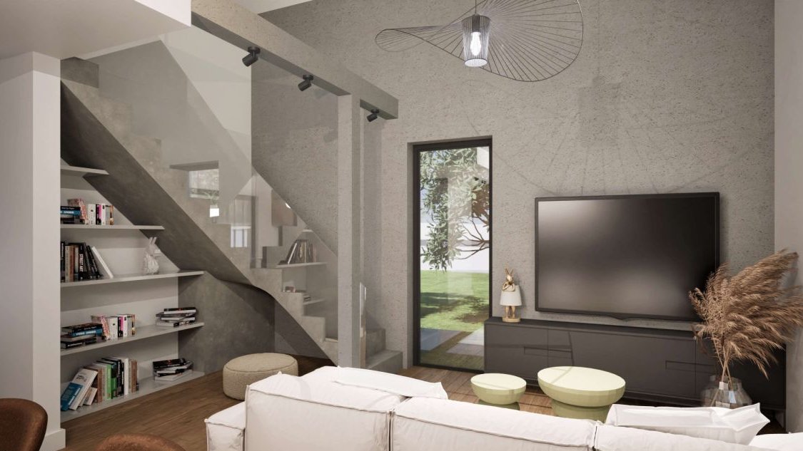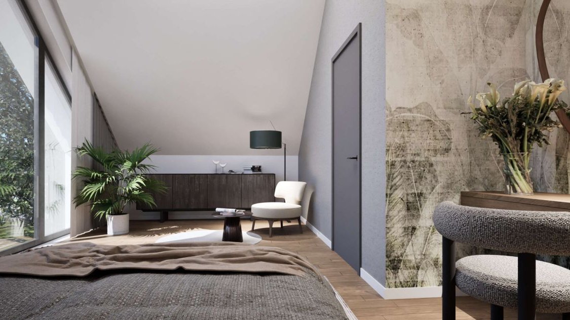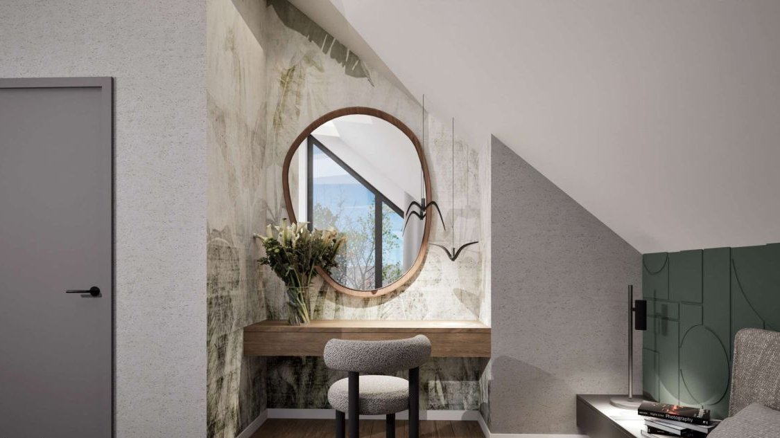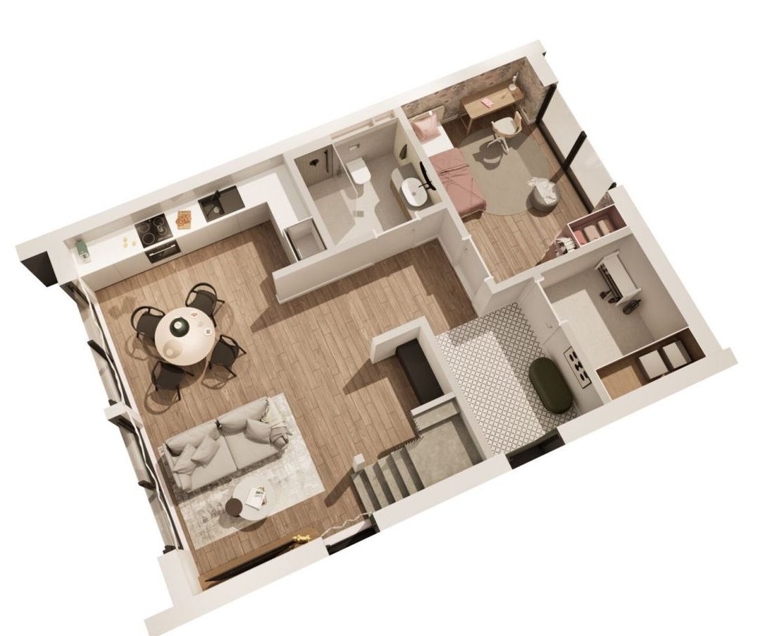 • Piętro (antresola): Otwarta przestrzeń na sypialnię lub biuro oraz dodatkowy, zamykany pokój.