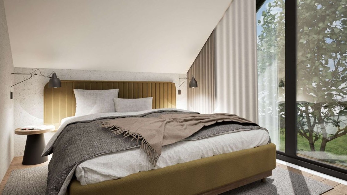 • Parter: Salon z aneksem, sypialnia, łazienka, pomieszczenie gospodarcze, wiatrołap.