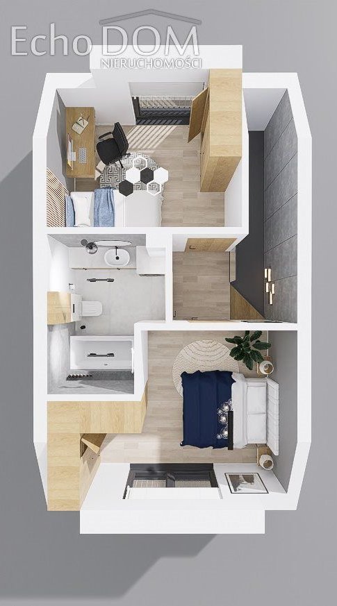 - poddasze: sypialnia (12,14m2), pokój (9,56m2), komunikacja (2,16m2), łazienka (5,46m2).