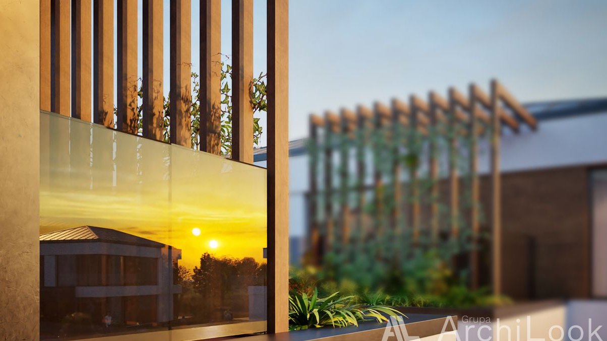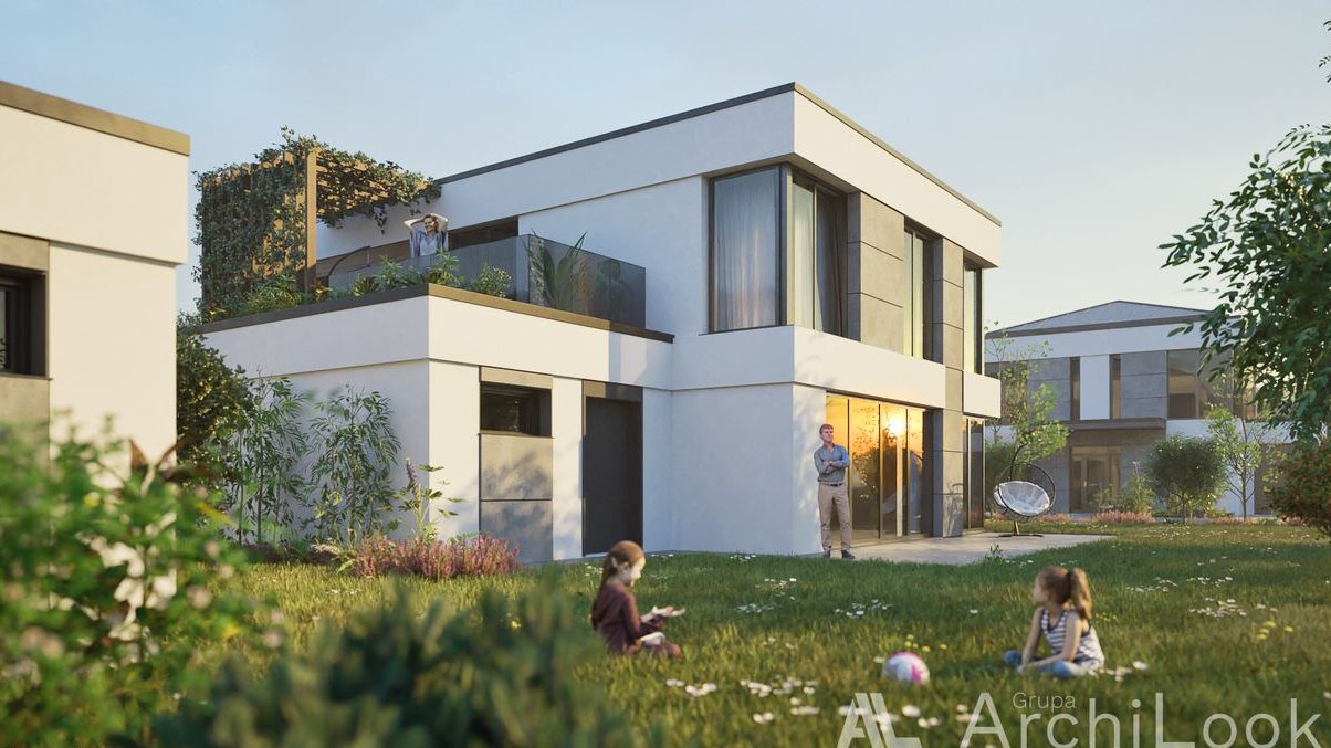 Każdy z prezentowanych domów będzie posiadał swój prywatny ok 25m2 taras zewnętrzny który będzie można przekształcić w ogród zimowy.