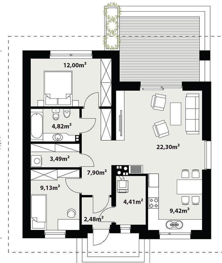 kotłownia, dwie sypialnie, przestronny salon, kuchnia, łazienka, wiatrołap, garaż