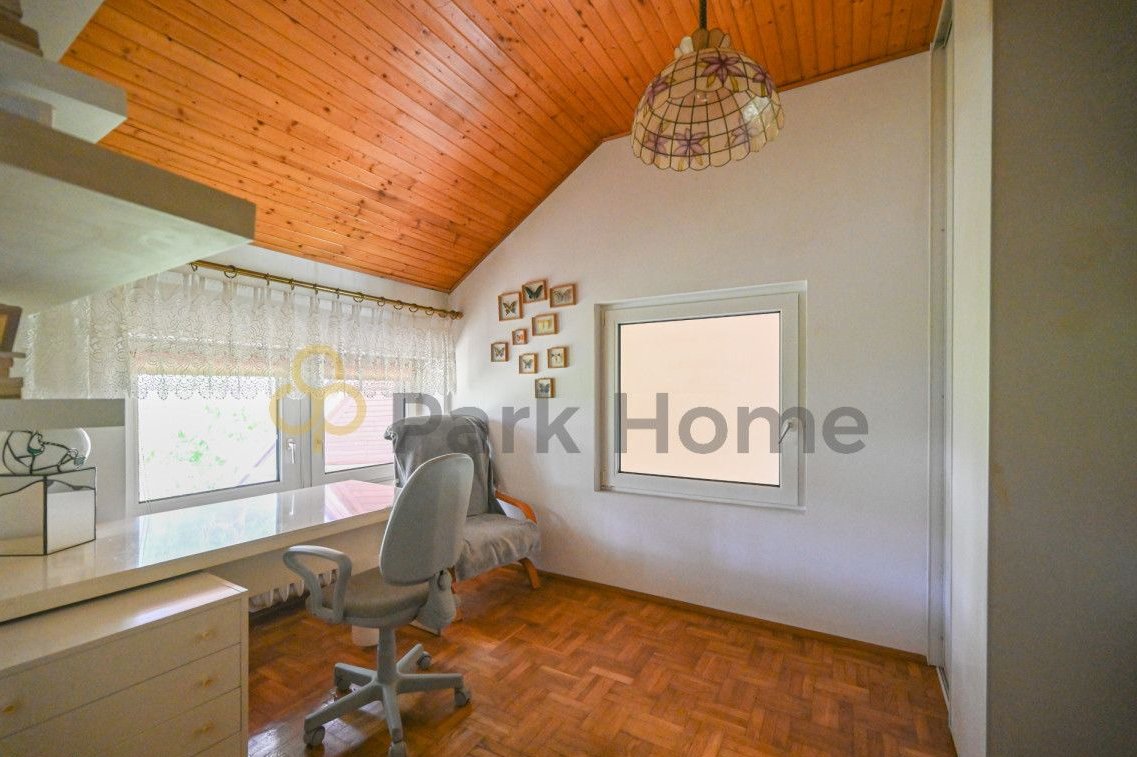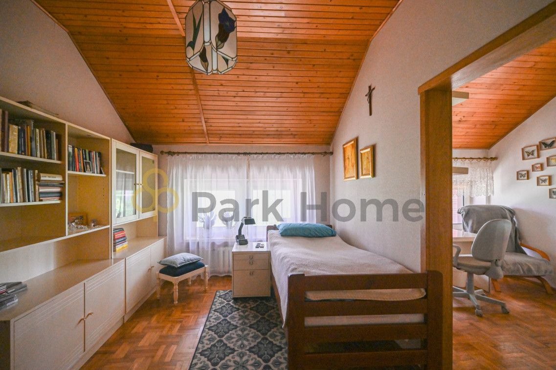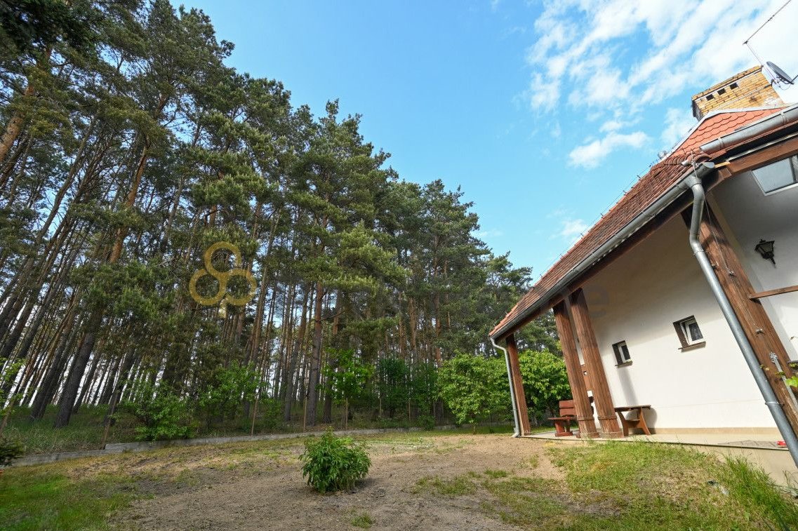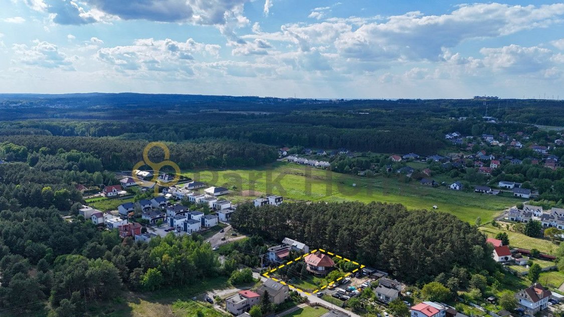 Do nieruchomości przynależy w pełni ogrodzona, zielona działka o powierzchni 1 664 m², częściowo zadrzewiona i dająca sporo możliwości zagospodarowania — np. pod wiatę, ogród, strefę wypoczynku czy dodatkowe miejsce do przechowywania. Z tyłu posesji znajduje się niewielki fragment lasu (ok. 1,23 ha) — dosłownie za płotem, co daje przyjemne poczucie kontaktu z naturą. Dom jest schowany w głębi działki, co zwiększa prywatność, a taras znajduje się wyraźnie powyżej poziomu drogi i jest zwrócony głównie od słonecznej strony południowej.