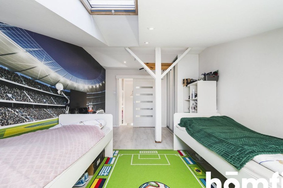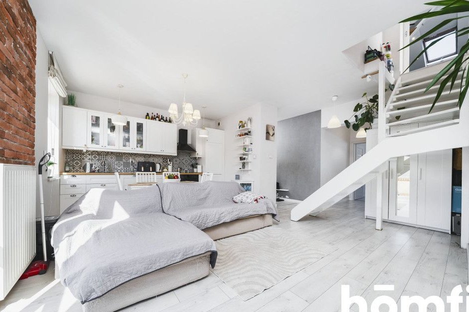 This is a double-sided apartment. The living room is completely open to the kitchen and very well-lit, with windows facing southwest. On the opposite side, there is the master bedroom. The second room is located in the attic space.