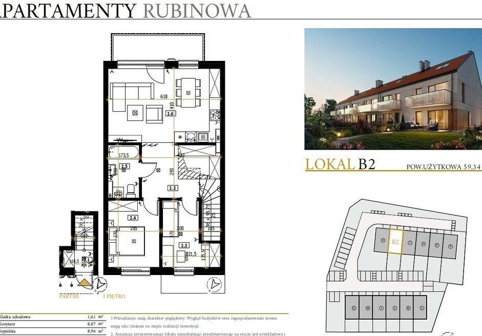 I PIĘTRO – cztery apartamenty trzypokojowe o powierzchni 59, 34 m2,