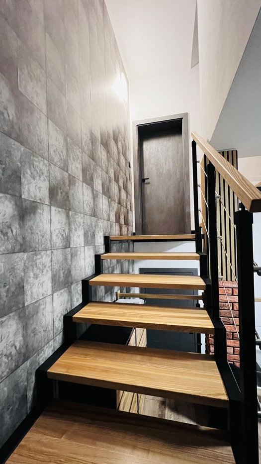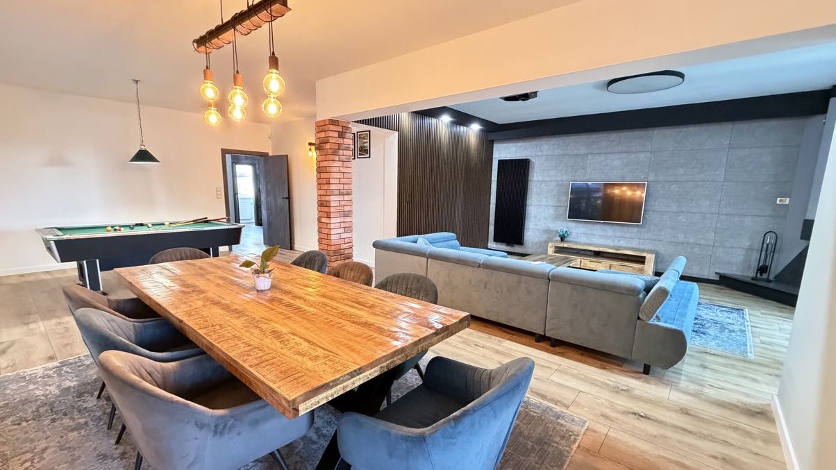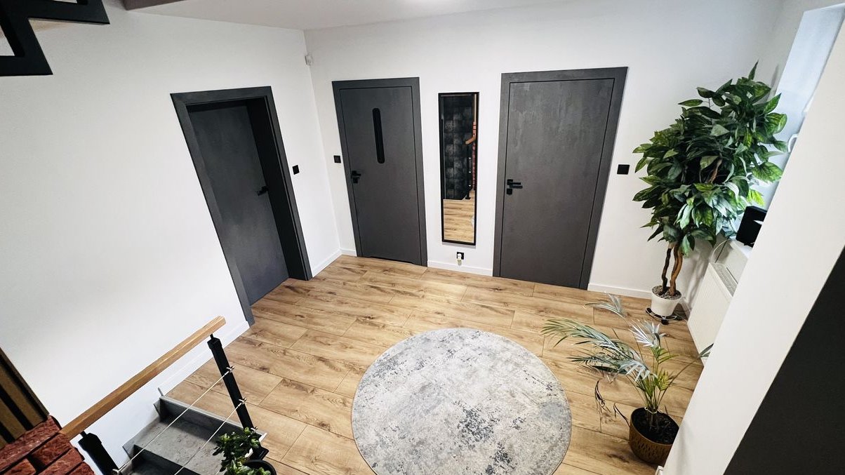 Dom o powierzchni użytkowej 245,0 m2 składa się z 6 pokoi w tym duży salon kinowy z jadalnią i kominkiem z wyjściem na ogród zimowy z klimatyzacją firmy Haier i drugim wyjściem na obszerny taras z wbudowanym grilem, na tym samym piętrze od strony ulicy znajduje się pokój, który może pełnić funkcję biurową, na półpiętrze zlokalizowany został komfortowy pokój gościnny, dalej na piętrze to już przestrzeń rodzinna, gdzie umiejscowione są 2 pokoje dziecięce z wyjściami na balkon z widokiem na ogród, wspólna oddzielna garderoba, pralnia, duża łazienka i sypialnia rodziców z garderobą, 3 komfortowe łazienki na każdej płaszczyźnie, półotwartej kuchni z wyjściem na taras i ogród oraz obszernego garażu, który pomieści dużego suwa, motocykl i rowery dla całej rodziny. Jeśli przyjdzie ochota, to można spędzić czas na wspólnych treningach w sali rekreacyjnej, gdzie każdy znajdzie coś dla siebie. Dla osób lubiących mieć swoją przestrzeń na majsterkowanie idealnie spełni te oczekiwana oddzielne pomieszczenie wyposażone w stół, imadło i regały.