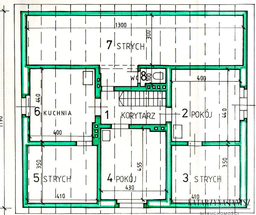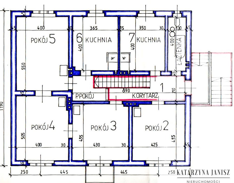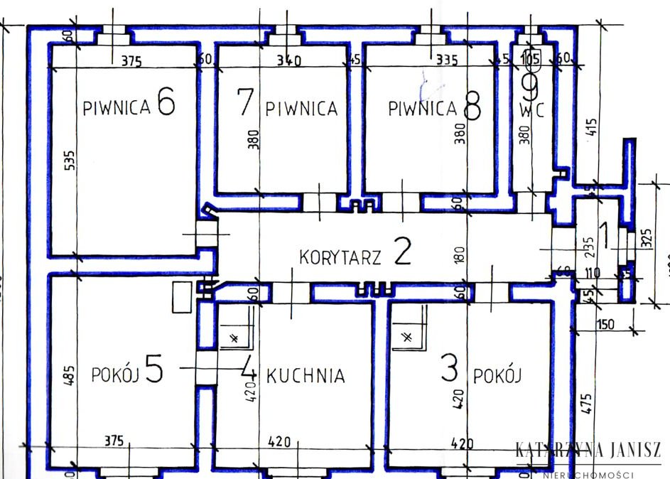 Łącznie - 9 pokoi, 3 kuchnie, dwie łazienki.