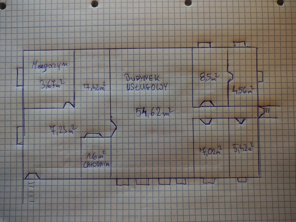 Na działce znajduje się też budynek usługowy o powierzchni 100 m² — dawniej wykorzystywany do produkcji wyrobów mącznych. Budynek podzielony jest na strefy sanitarne, chłodnię, magazyn i zaplecze socjalne. Wymaga odświeżenia, ale ma duży potencjał — można przystosować go na lokal usługowy, magazyn, pracownię albo nawet adaptować na cele mieszkalne.