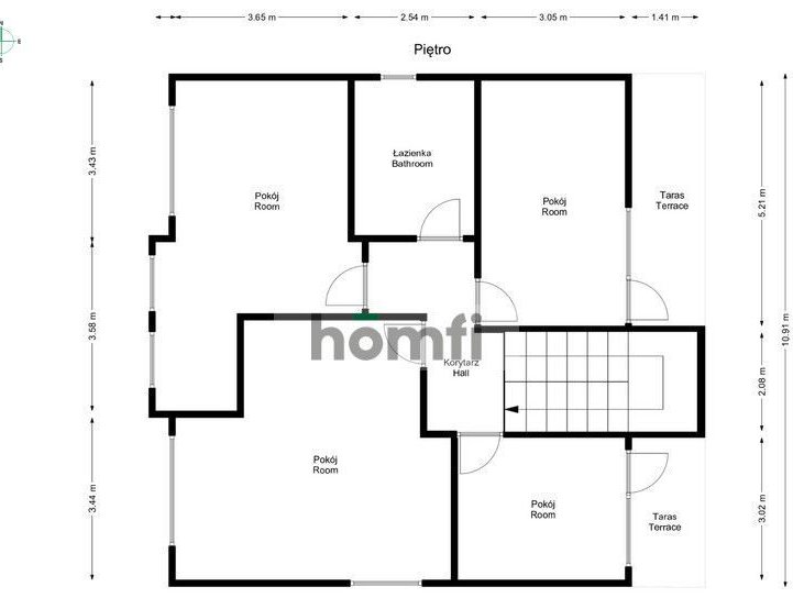 - piętro - cztery pokoje, łazienka, 2 tarasy