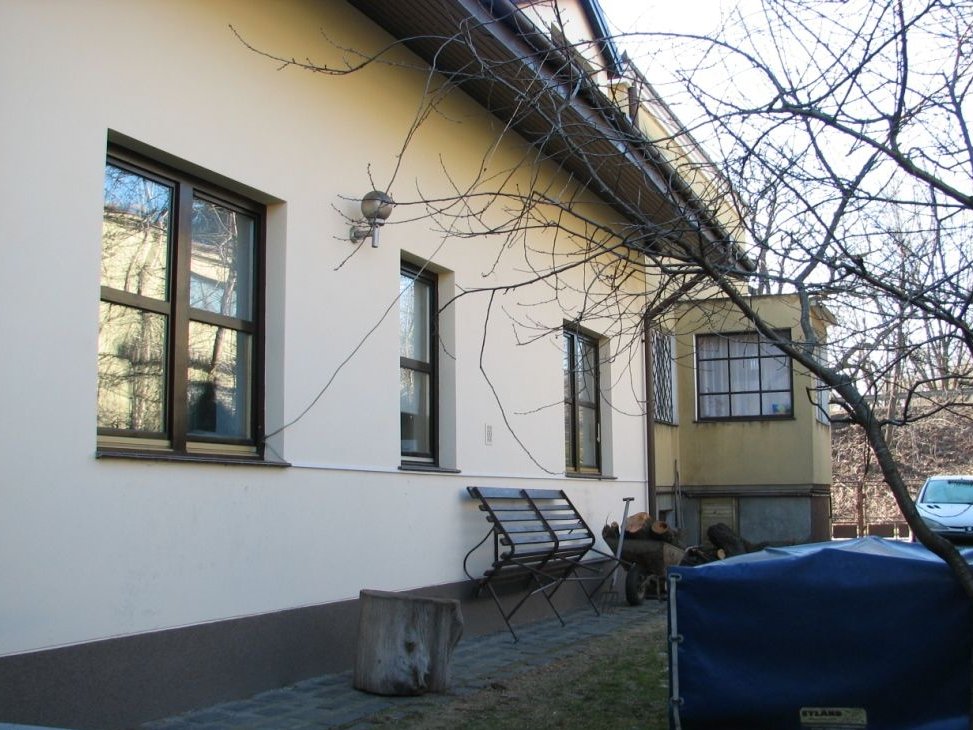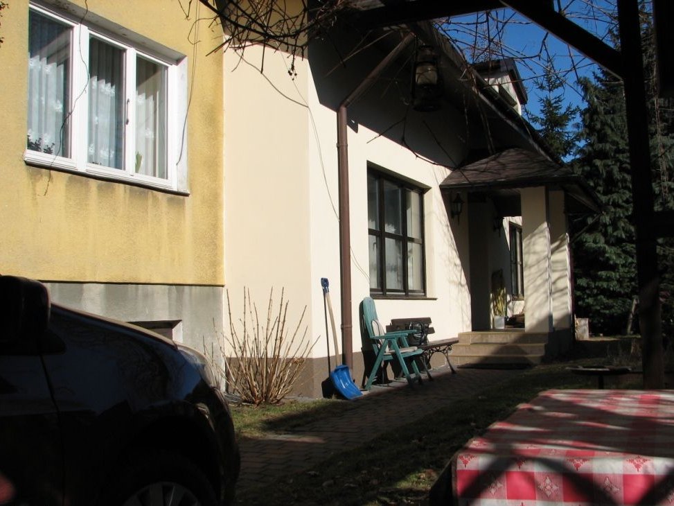 Rok budowy frontowego budynku 1975, powierzchnia użytkowa 100 m, podpiwniczony z garażem. Parter: weranda, przedpokój dwa pokoje, kuchnia, łazienka, piętro: trzy pokoje, łazienka.