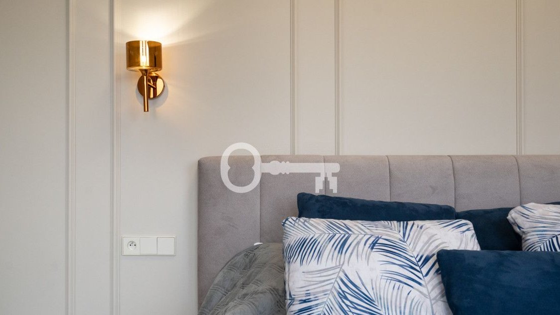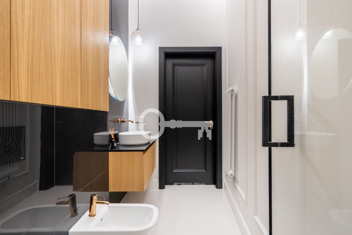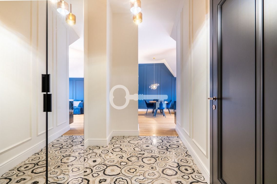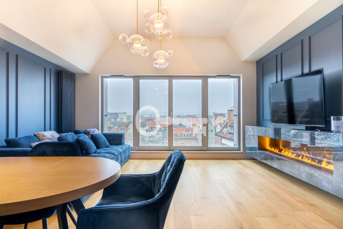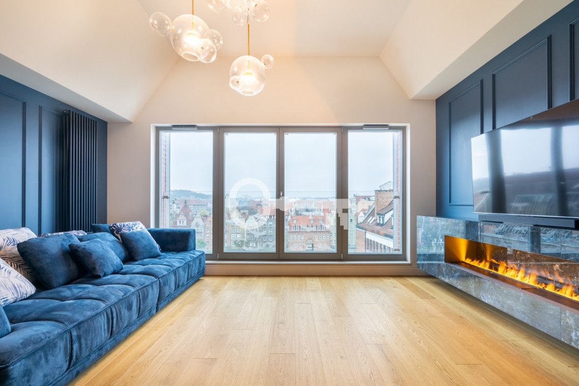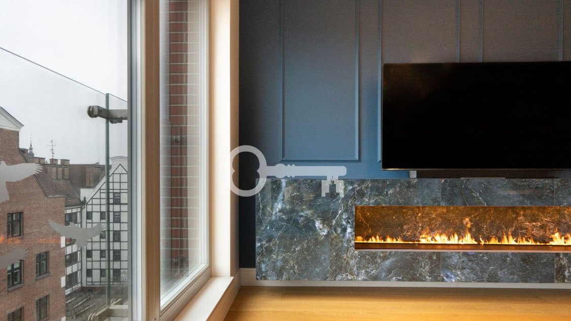 Apartament znajdujący się tuż obok ulicy Pszennej łączy w sobie szyk i elegancje. Wysokie na 330 cm pomieszczenia nadają nieruchomości dodatkowej nietuzinkowości. Minimalistyczna całość rozświetlana jest przez podwieszane oświetlenie. Znajdujący się w salonie kominek na parę wodną dodaje przytulności całej przestrzeni. Elektrycznie rozkładana ogromna kanapa dostarczy komfortu każdemu jej użytkownikowi. Czarna, połyskująca, górna część kuchenna złamana przemyślaną powierzchnią przy suficie obija widok na Motławę. Jasne fronty dolnych szafek i drewniana podłoga idealnie kontrastują z granatowo-czarnym wykończeniem nadając wnętrzu lekkości.