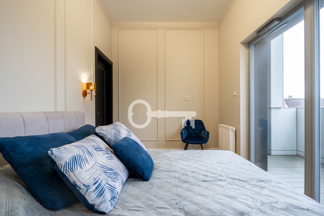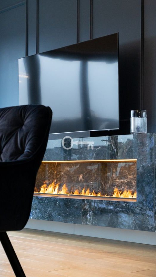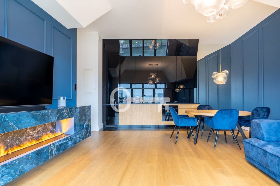 This apartment, located just off Pszenna Street, combines chic and elegance. The 330 cm high ceilings give the property an additional unique character. The minimalistic design is illuminated by suspended lighting. A steam fireplace in the living room adds a cozy touch to the entire space. An oversized, electric sofa bed provides comfort for every user. The glossy black kitchen upper area, broken up by a carefully designed ceiling panel, highlights the view of the Motława River. The light-colored fronts of the lower cabinets and the wooden floor contrast perfectly with the navy blue and black finish, lending the interior a light feel.