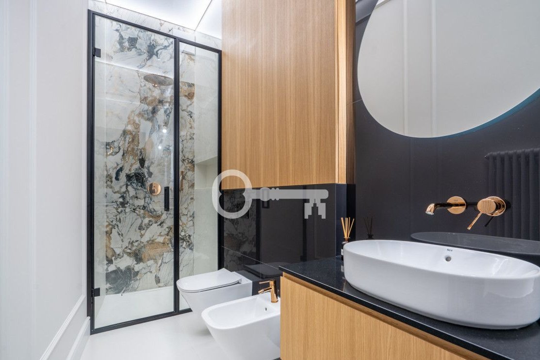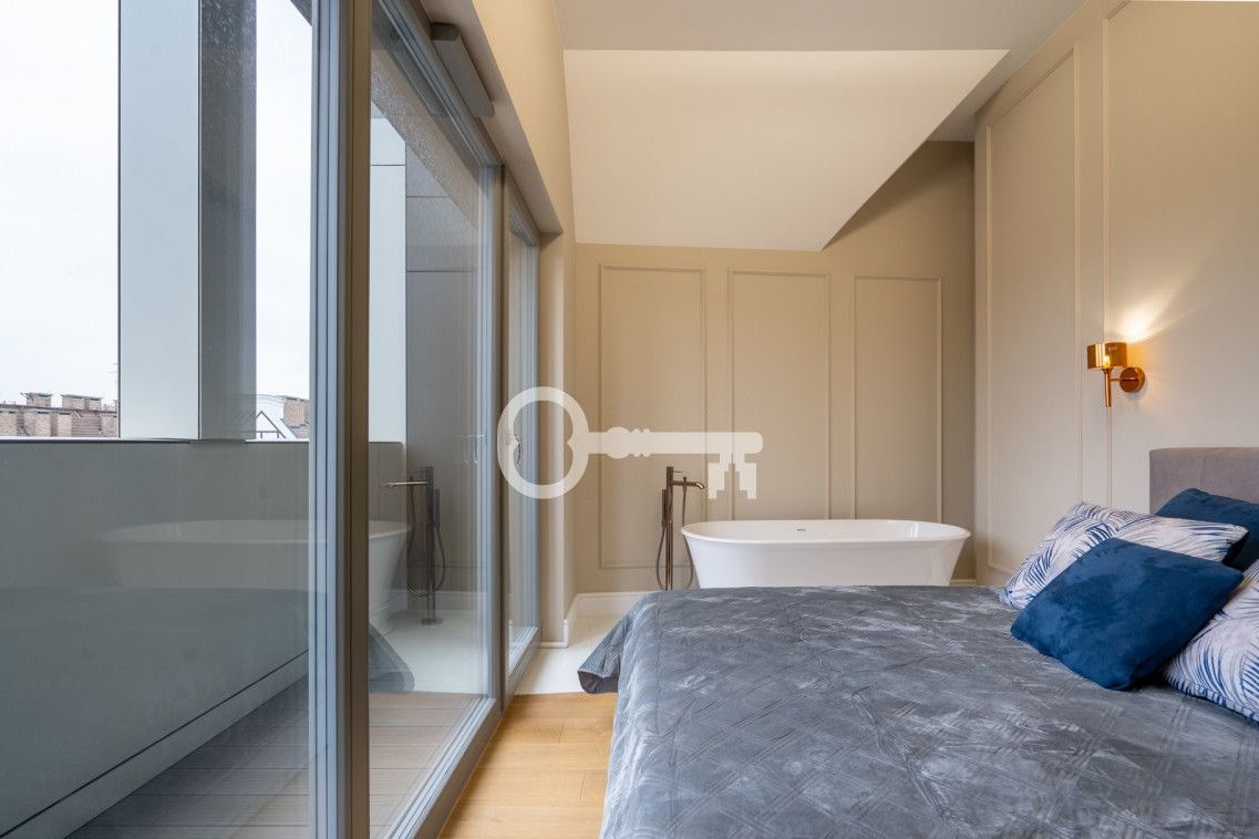 A bright bedroom with a comfortable double bed will ensure a high-quality rest. A rare bathtub in the bedroom allows for soaking with a view of the endless sky, thanks to the panoramic windows, which provide ample lighting.