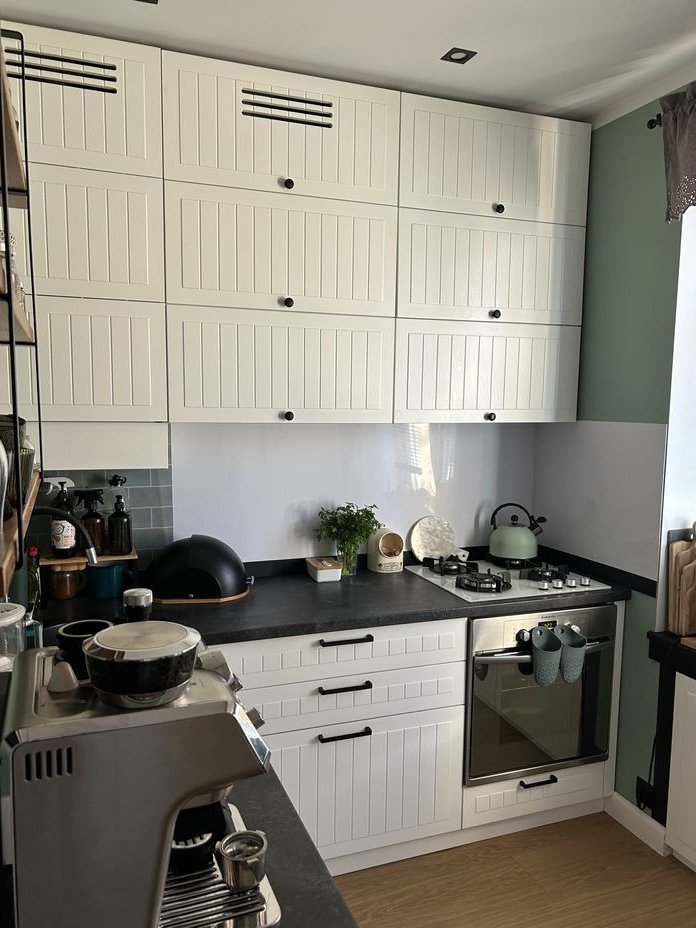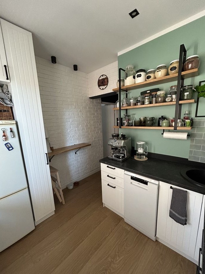 W kuchni znajdziesz potrzebny sprzęt, taki jak lodówka, piekarnik i płyta grzewcza i zmywarka oraz piękne i praktyczne meble robione na zamówienie .