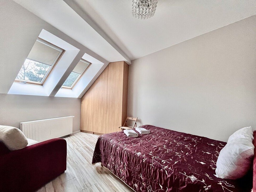 Łóżko małżeńskie – typu king beds od strony parku z 2 oknami dachowymi, co czyni ją idealną do spania w ciszy oraz możliwością obserwowania nieba i ptactwa w wysokich koronach drzew, które chętnie odwiedza otaczający apartamentowiec park ze starym drzewostanem