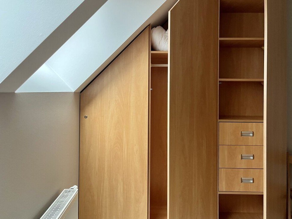 Duża szafa w zabudowie na całej wysokości i szerokości jednej ze ścian, która nie koliduje z codziennego korzystania z tego pokoju