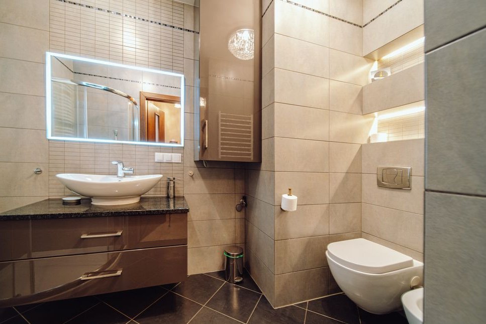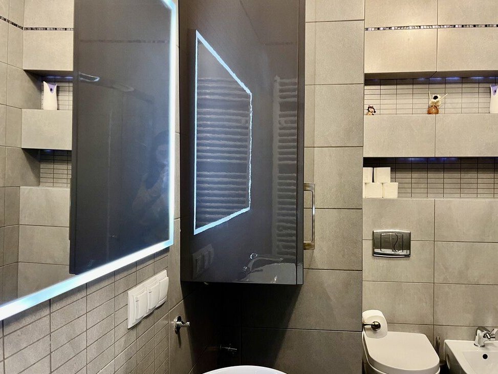 Jasna i przestronna łazienka – nowa armatura, meble i kabina prysznicowa.