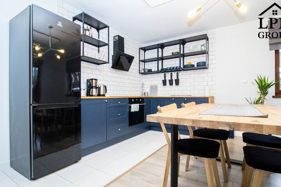 Salon z aneksem kuchennym wyposażonym w meble, lodówkę, płytę indukcyjną, piekarnik, zmywarkę, zlewozmywak.