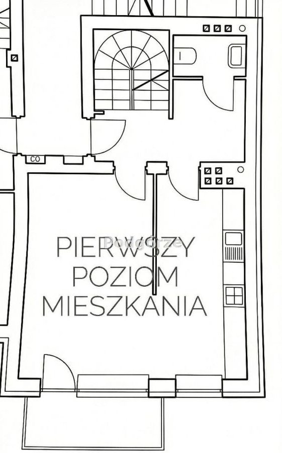 - pierwszy poziom: kuchnia ( z oknem) połączona z salonem, łazienka oraz przedpokój
