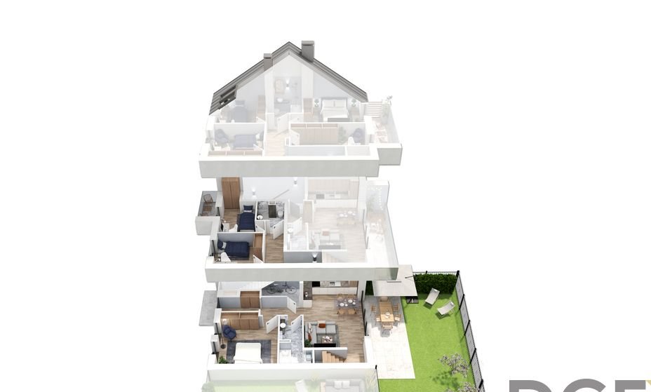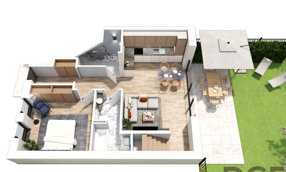 Dwupoziomowy rozkład powstał z myślą o komforcie codziennego życia i zapewnia wyraźny podział na strefę dzienną i prywatną. Parter otwiera przestronny salon połączony z aneksem kuchennym, z którego panoramiczne okna prowadzą bezpośrednio do prywatnego ogródka. Dodatkowy pokój idealny na gabinet, sypialnię czy pokój gościnny i łazienka.