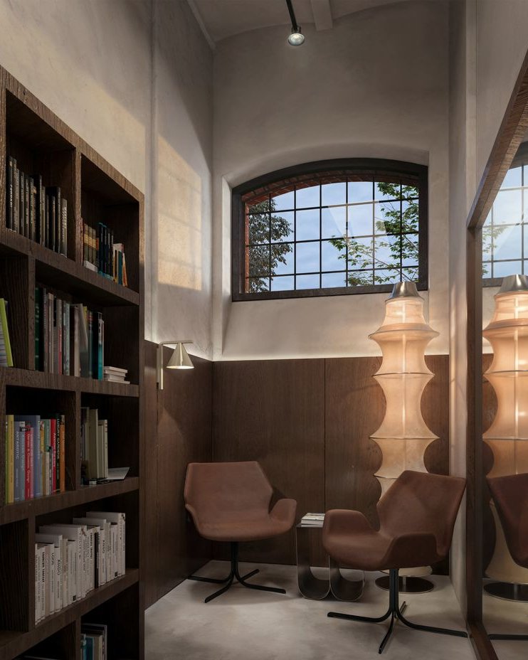 Zielony ogródek między ścianami z historycznymi cegłami oraz efektywnie wyeksponowaną zewnętrzna więźba, to inspirująca przestrzeń dająca intymność i spokój – idealna na poranny rytuał, wieczorne spotkania czy odpoczynek z książką.