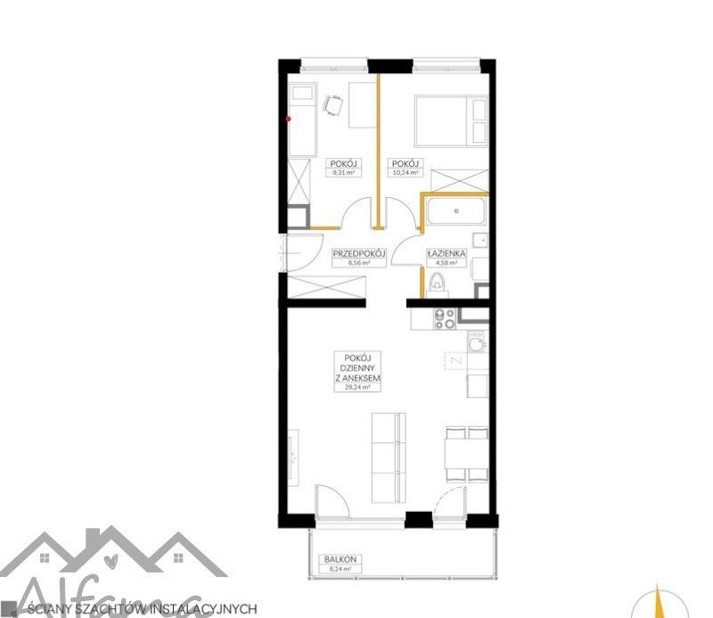 Mieszkanie składa się z przestronnego salonu z aneksem kuchennym(29m2), 2 sypialni, ustawnego przedpokoju, łazienki, oraz dodatkowo dużego balkonu(6.20m) od południa.