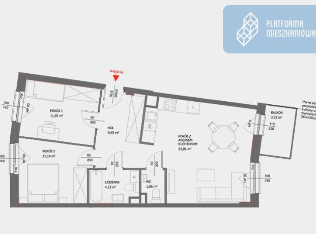 - Przestronny salon z aneksem kuchennym i wyjściem na balkon