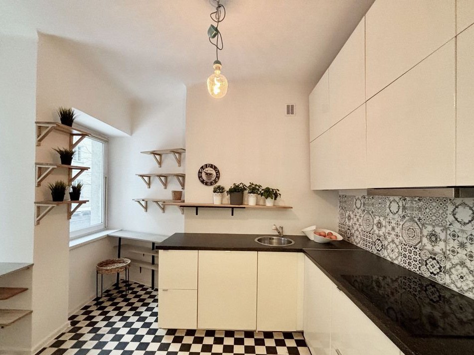 •Niezwykły klimat wnętrz — duże okna, drewniana podłoga, wysokie sufity oraz elementy zabudowy charakterystyczne dla kamienic.