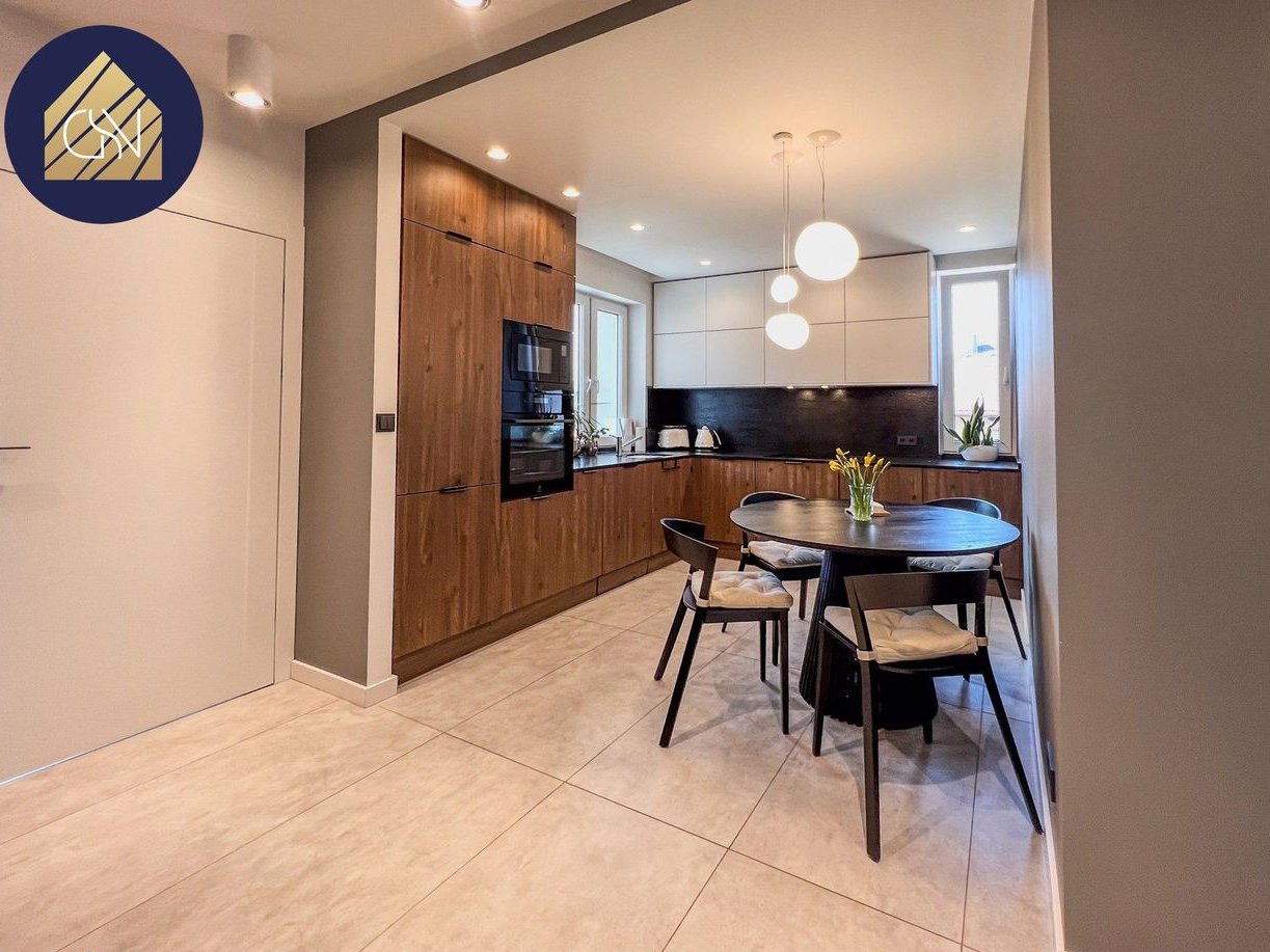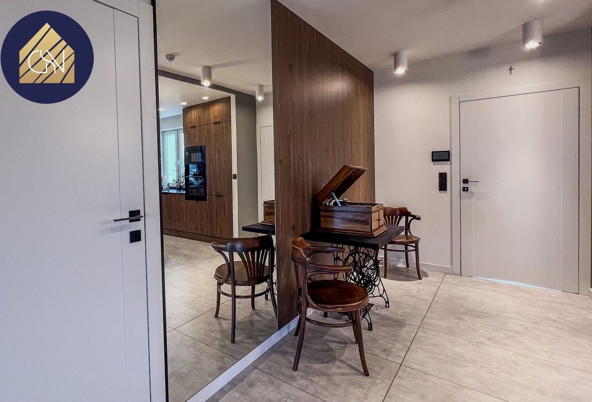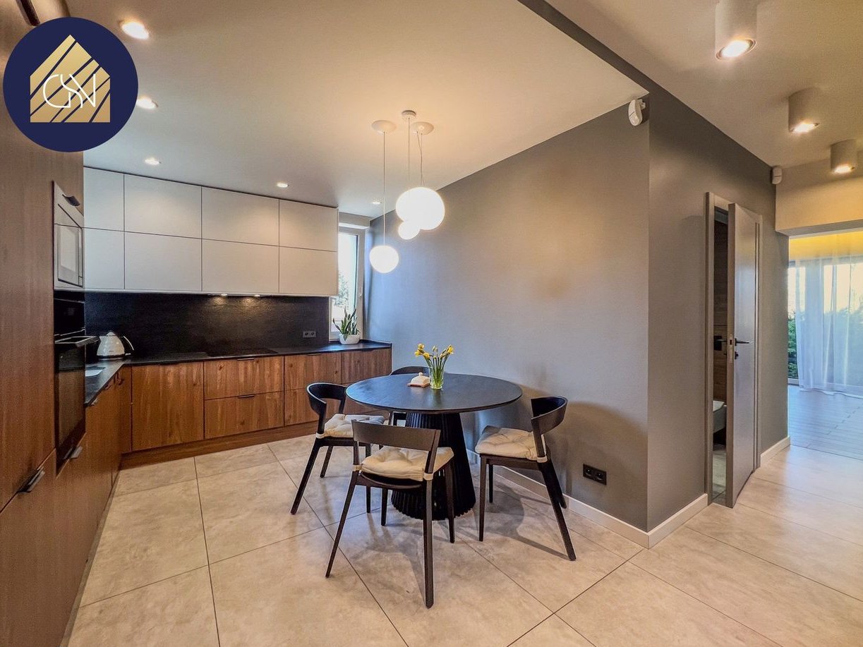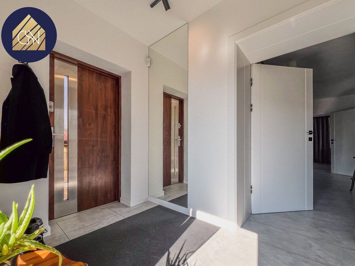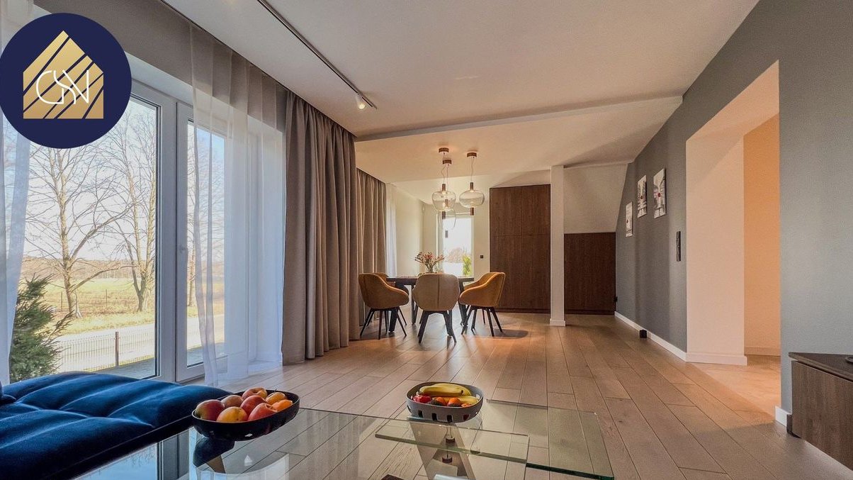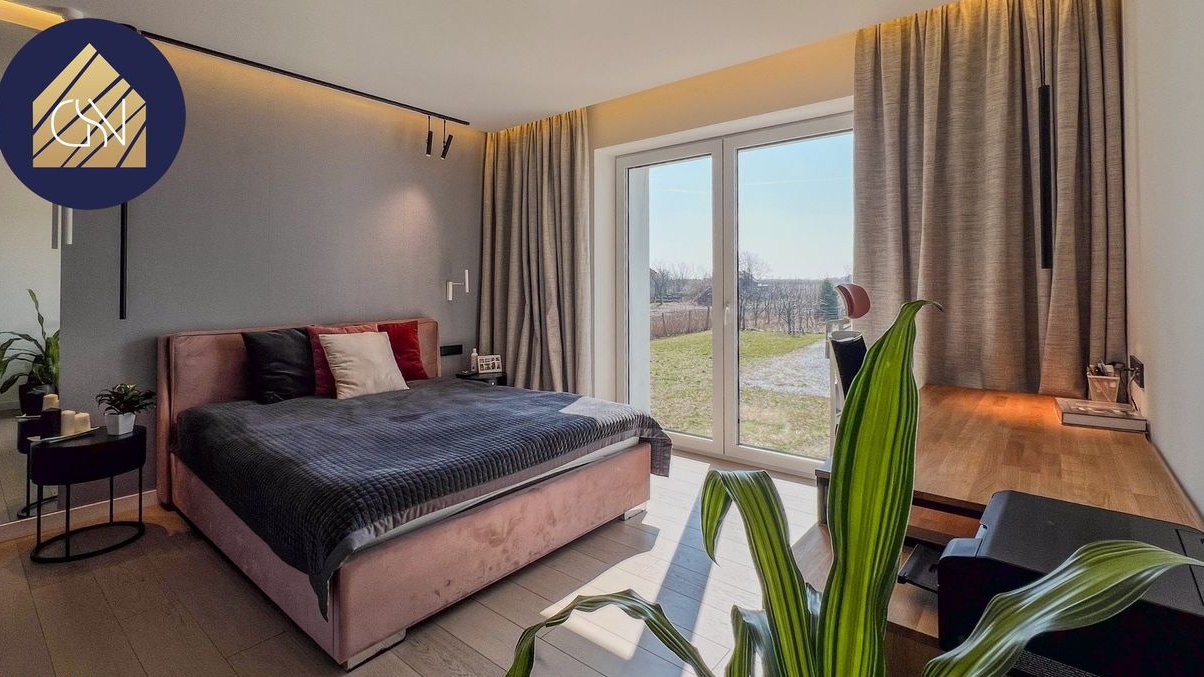 Wszystkie pomieszczenia są bardzo widne dzięki dużym oknom. Nowoczesne oświetlenie wieczorem tworzy przyjemny klimat, a użyte materiały i kolory są spójne oraz bardzo eleganckie.