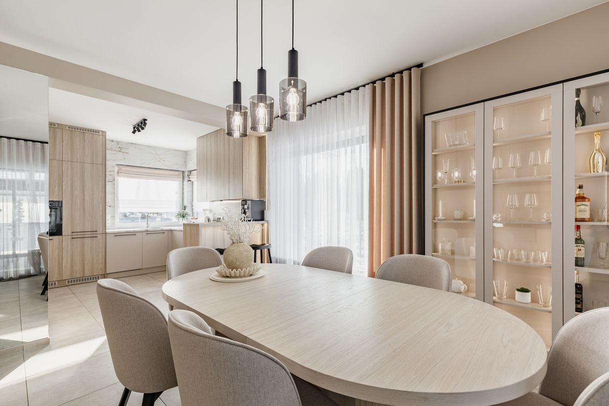 Funkcjonalność: kuchnia ze spiżarką otwarta na salon z jadalnią i wyjściem na oranżerię- sprzyja spotkaniom rodzinnym i towarzyskim, łatwa interakcja podczas przygotowywania posiłków.