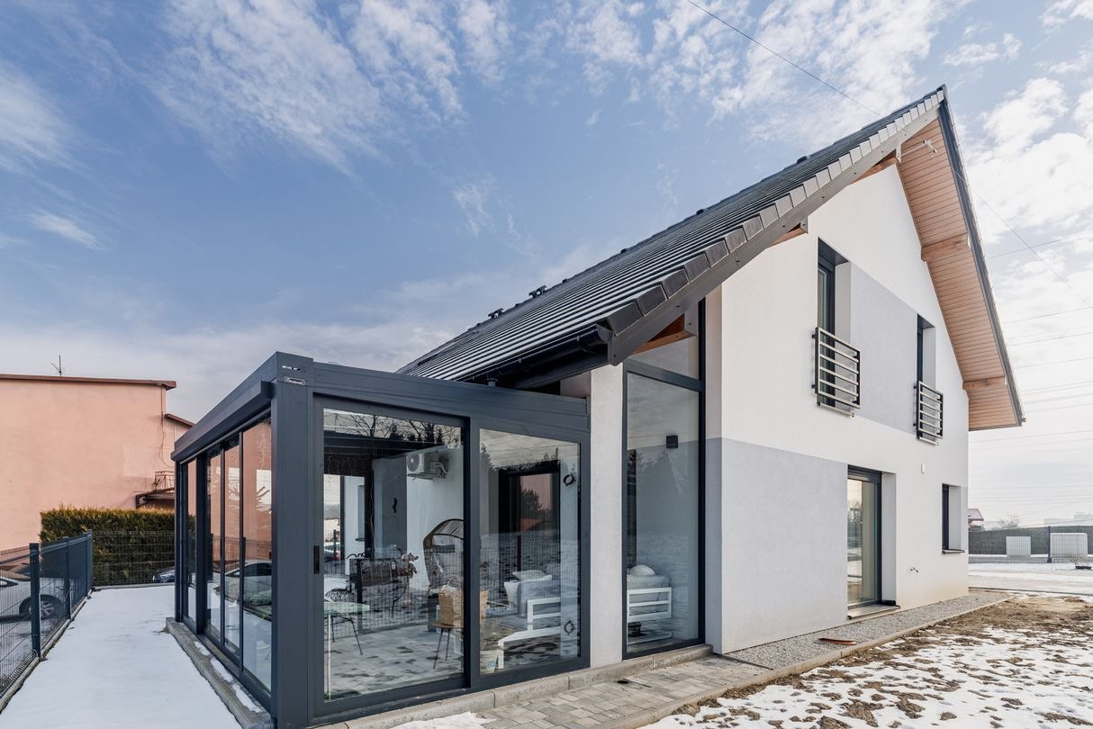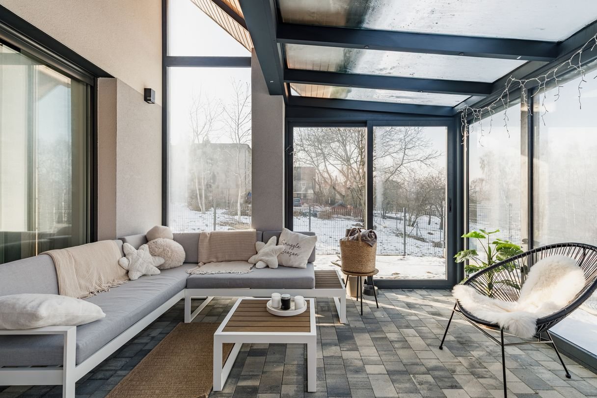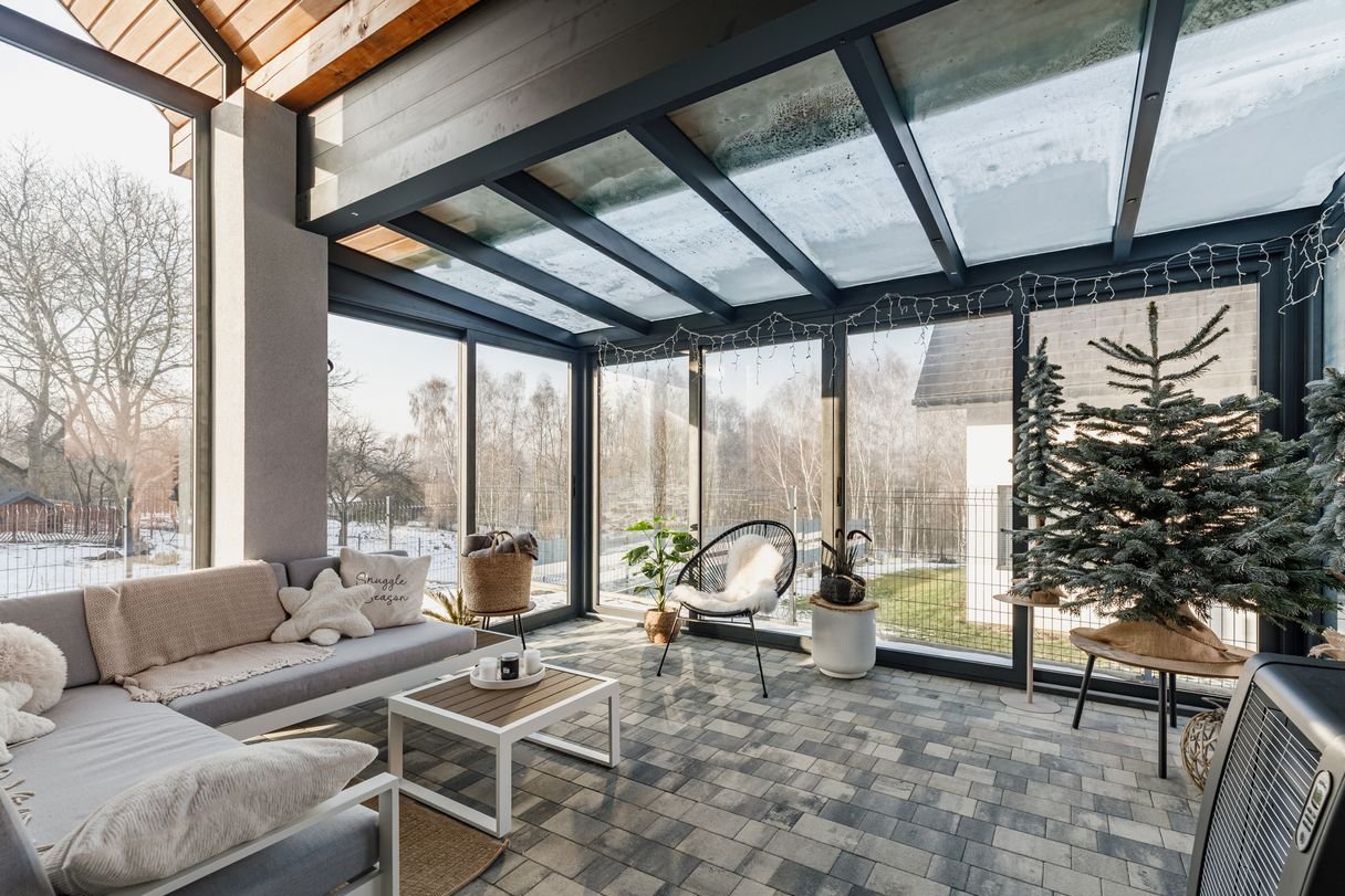 Przeszklona Oranżeria wkomponowana w bryłę budynku z wyjściem na ogród - pełni funkcję wypoczynkową o każdej porze roku, bez względu na pogodę.