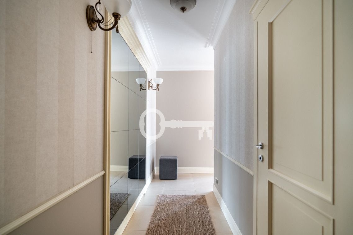 * Hallway (8.00 m²) with elegant finishes from the moment you enter - wallpapered walls, decorative moldings, a large mirror, and tasteful wall sconces.