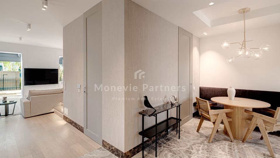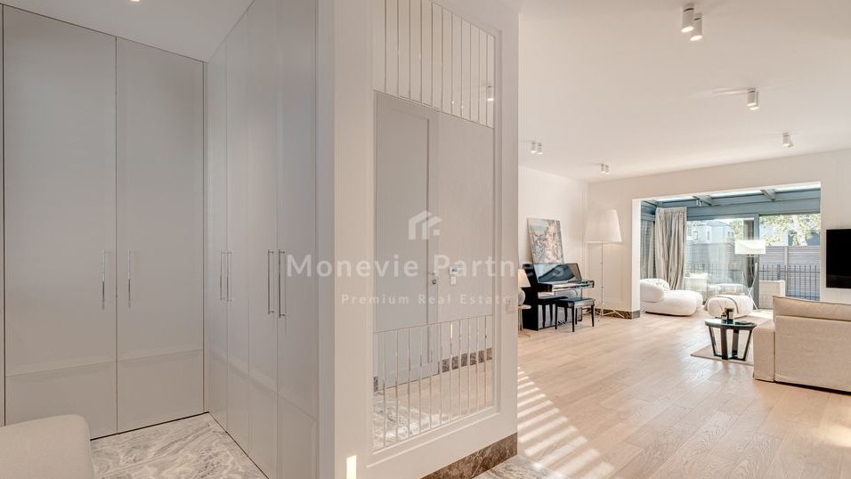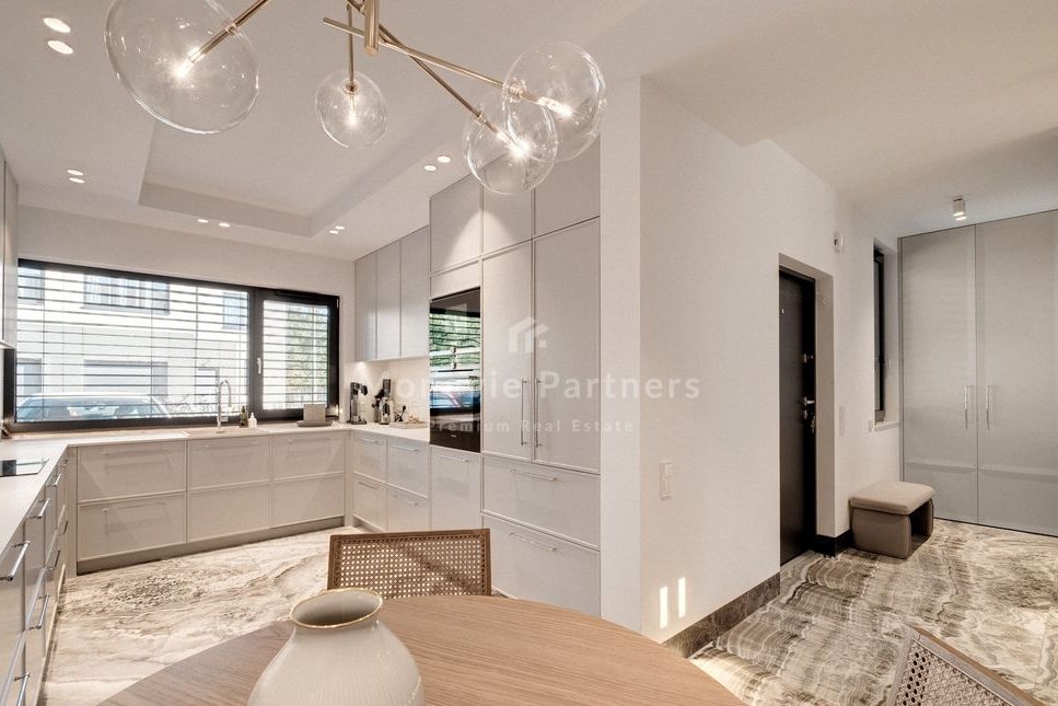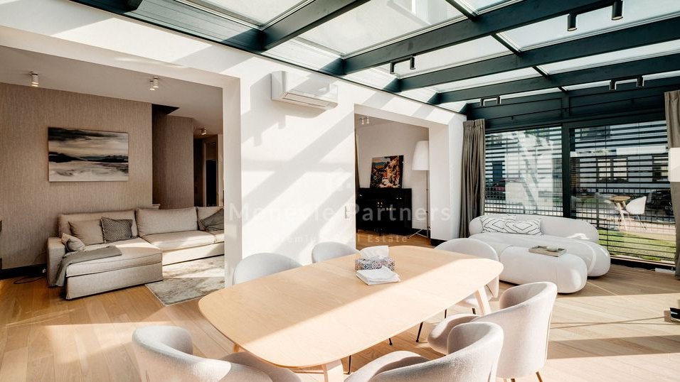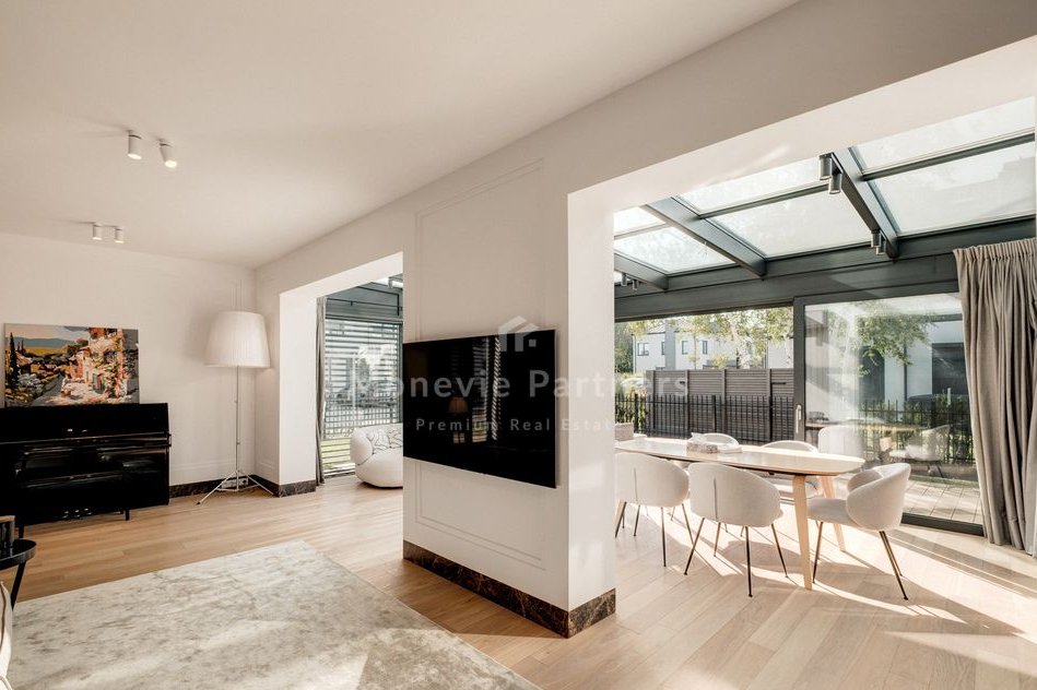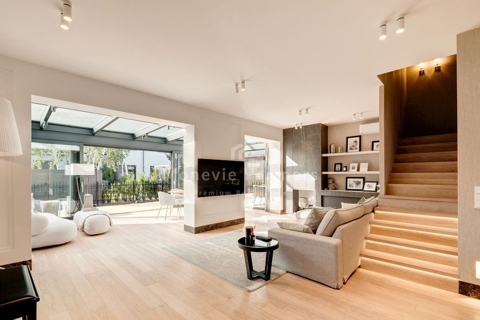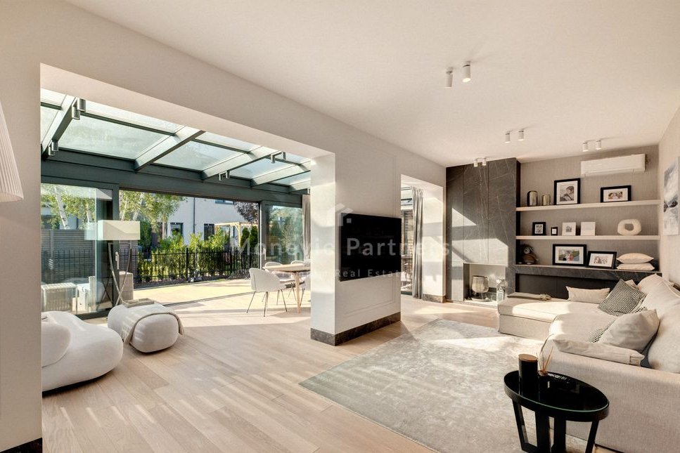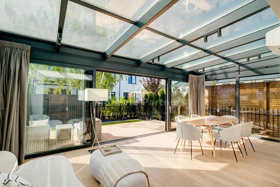 The focal point of the living room is a fantastic winter garden-style enclosure, custom-built by the developer. This makes the living room significantly larger and brighter than the neighboring houses. Ideal for a family with children who value a high standard of living, peace and quiet, and quick and easy access to the city.
