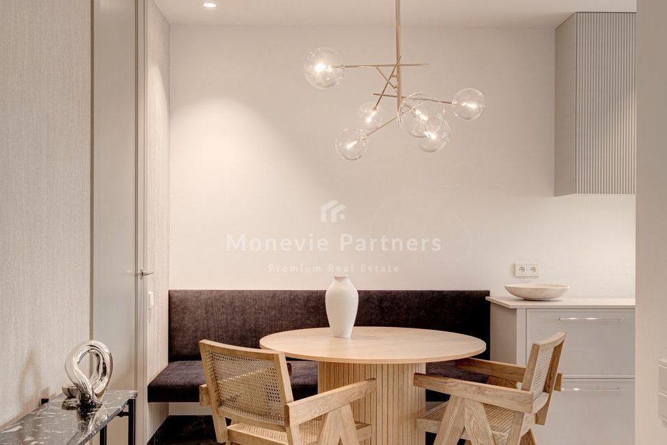 A multitude of elegant, custom-made, permanent fixtures. High-quality materials, including stone, sintered stone in fantastic colors, and wood. Attention to lighting.