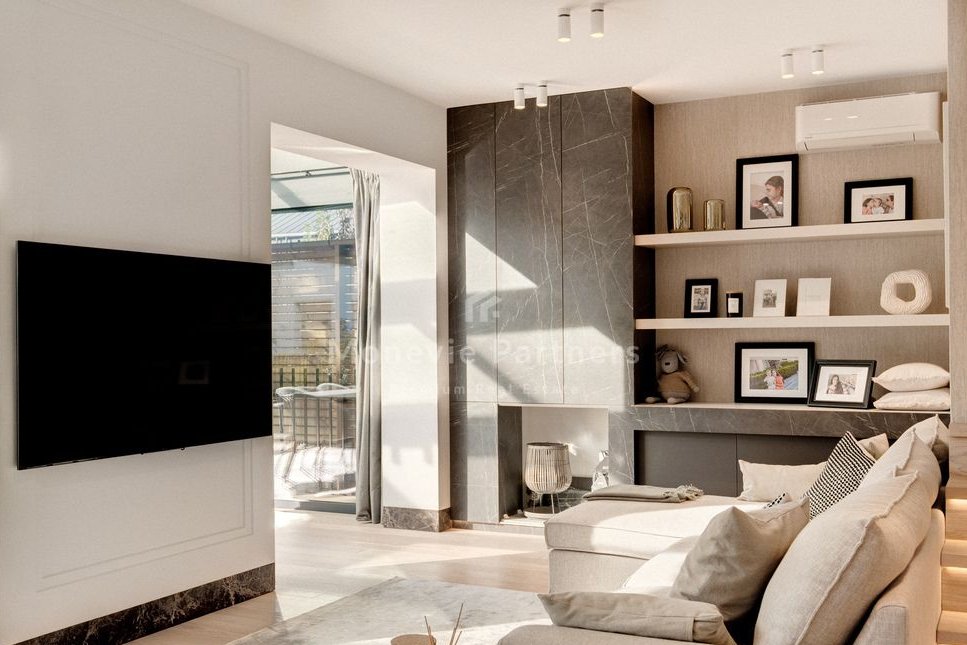 A fantastic, spacious, and bright, glass-enclosed living room. The windows feature blinds and roller shutters. Underfloor heating throughout the ground floor and bathrooms upstairs. The entire house boasts above-standard high doors, extending all the way to the ceiling. An electric fireplace. Air conditioning. Low maintenance costs.
