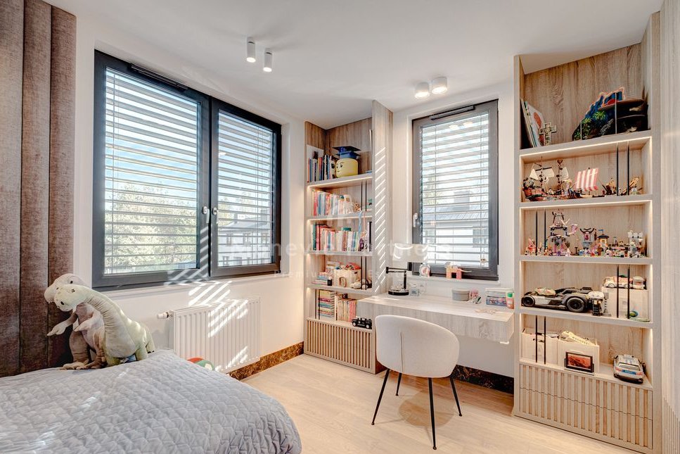 This is an absolutely innovative way of thinking about a peaceful, yet active lifestyle within easy reach of Warsaw. Access to the capital is quick and convenient—just 30 minutes away. The house is large, very bright, and spacious, finished to the highest standard, with meticulous attention to detail and a high level of comfort for its residents, by renowned and respected architect Katarzyna Kraszewska.