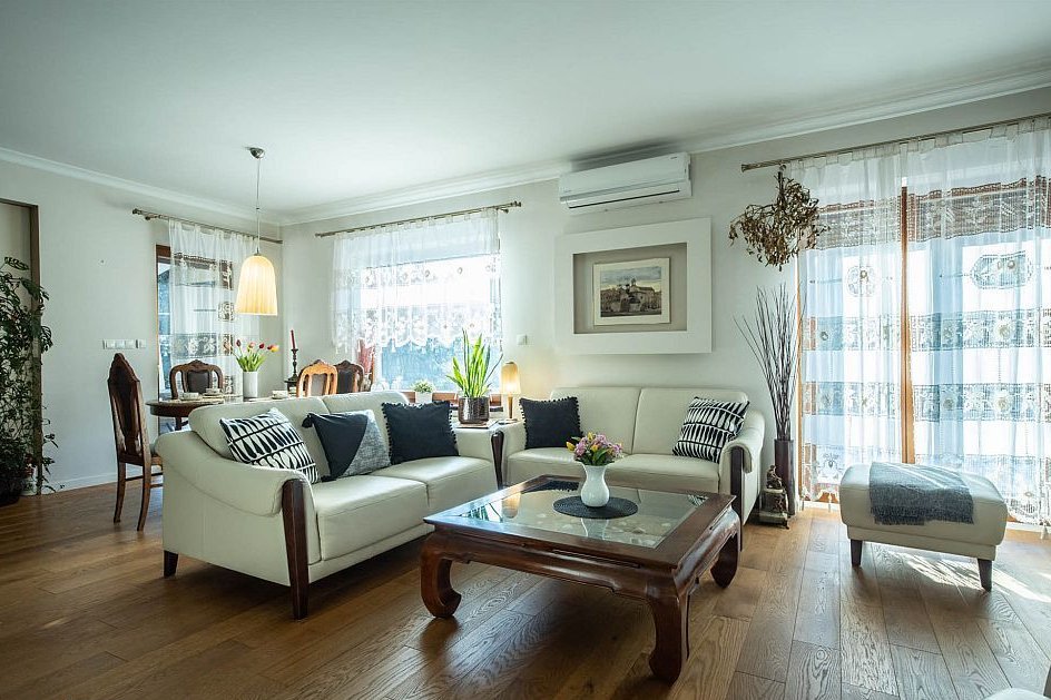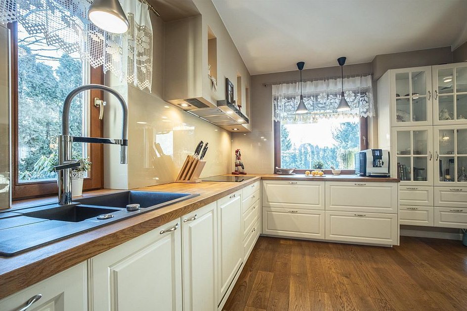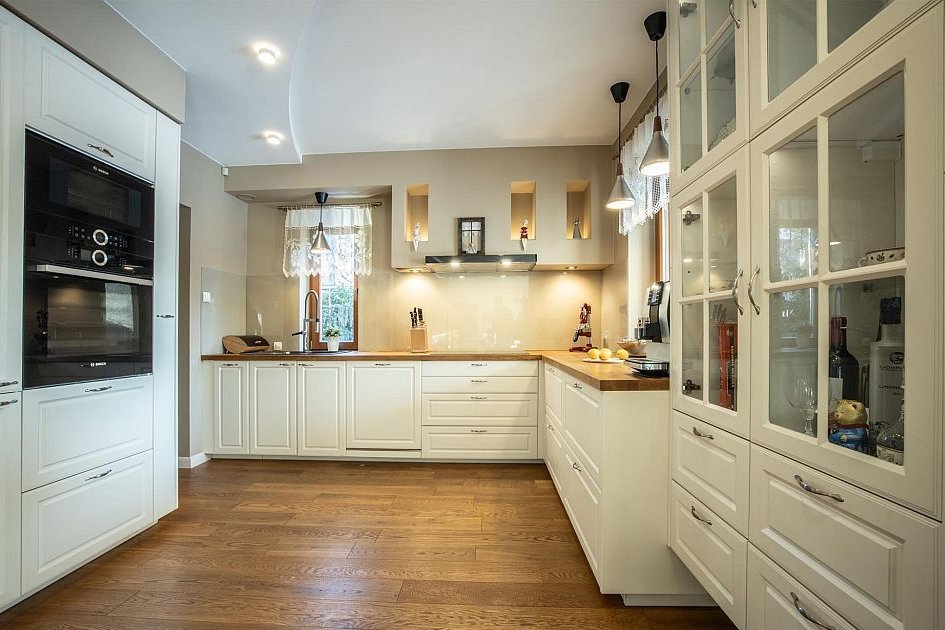 Kuchnia wyposażona w meble wykonane na zamówienie (2-letnie), blaty dębowe oraz sprzęt AGD marek Bosch, Samsung i AEG — najwyższe modele, wliczone w cenę nieruchomości.