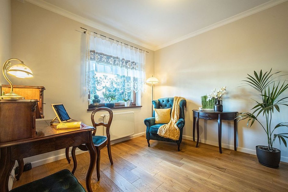 W ogrodzie znajduje się również drewniany domek o powierzchni ok. 10 m² przeznaczony na drewno i narzędzia ogrodowe. Trzy miejsca parkingowe na posesji.