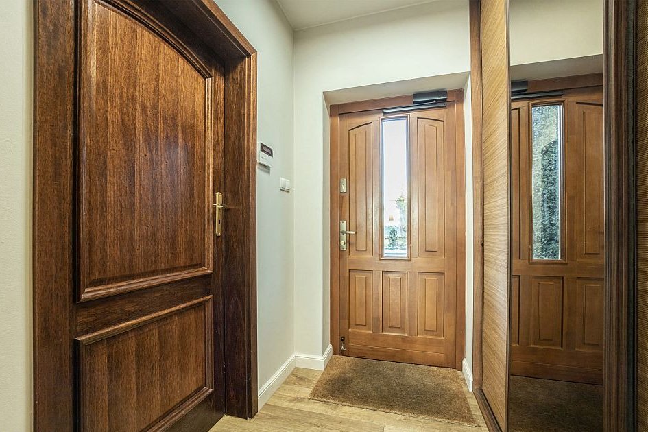 Okna PCV, drzwi wewnętrzne drewniane. Na podłogach na parterze deska dębowa olejowana, piętro - panel z drewna egzotycznego.
